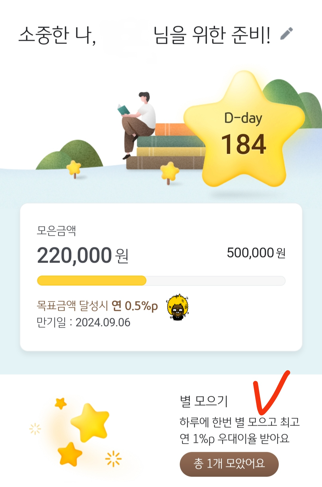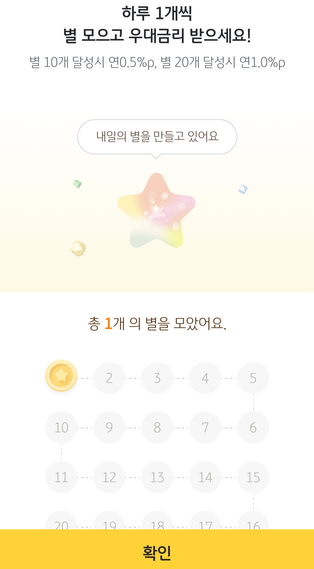 별은 특별한 적금 전용화면에서 모을 수 있으며, 별을 10개 모으면 0.5%, 20개 모으면 1%를 올릴 수 있어요.