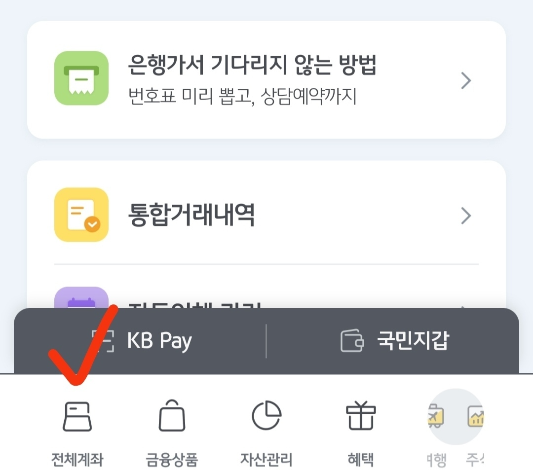 전용화면 이동 방법은 KB스타뱅킹 앱 첫 화면에서 아래 항목 중 '전체계좌'를 클릭합니다.