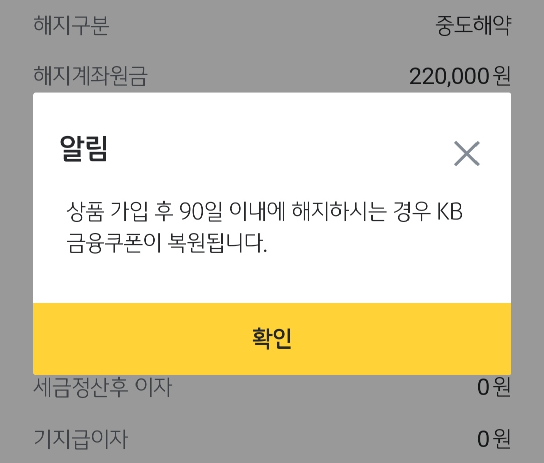 해지할 때 보니까 이렇게 '상품 가입 후 90일 이내에 해지하시는 경우 KB 금융쿠폰이 복원됩니다'라고 뜨더라고요.