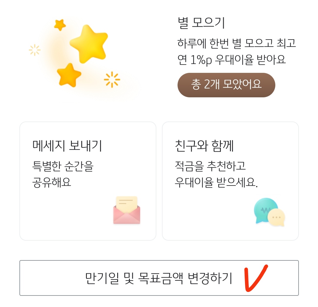 변경은 특별한 적금 전용화면에서 하시면 되는데, 전용화면 이동 방법은 아래 별모으기 방법에서 설명드릴게요.