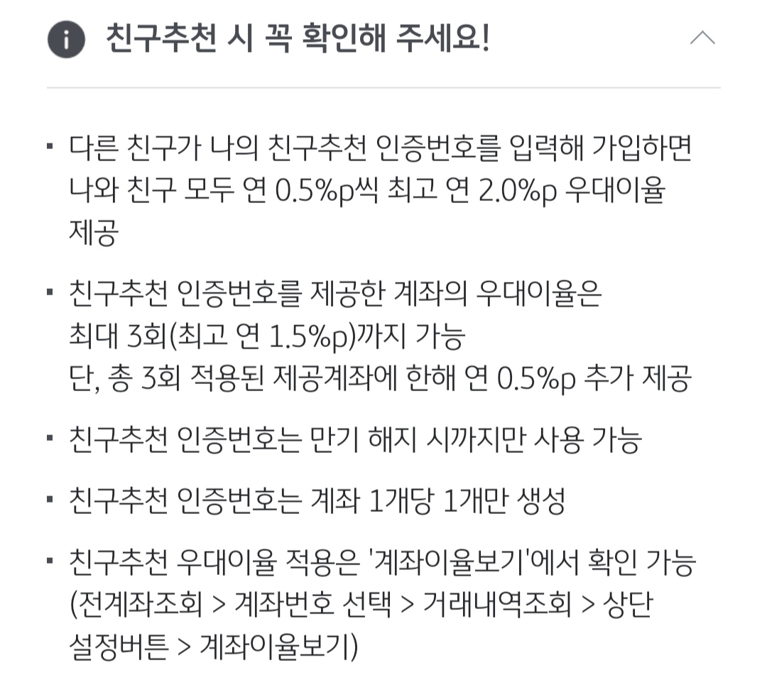 여러분이 제 인증번호를 넣어주시면 저도 0.5%, 여러분도 0.5%를 받게 됩니다. 그리고 이후에는 여러분의 친구추천 인증번호로 가족이나 지인이 가입할 시 0.5%를 또 받으실 수 있어요.