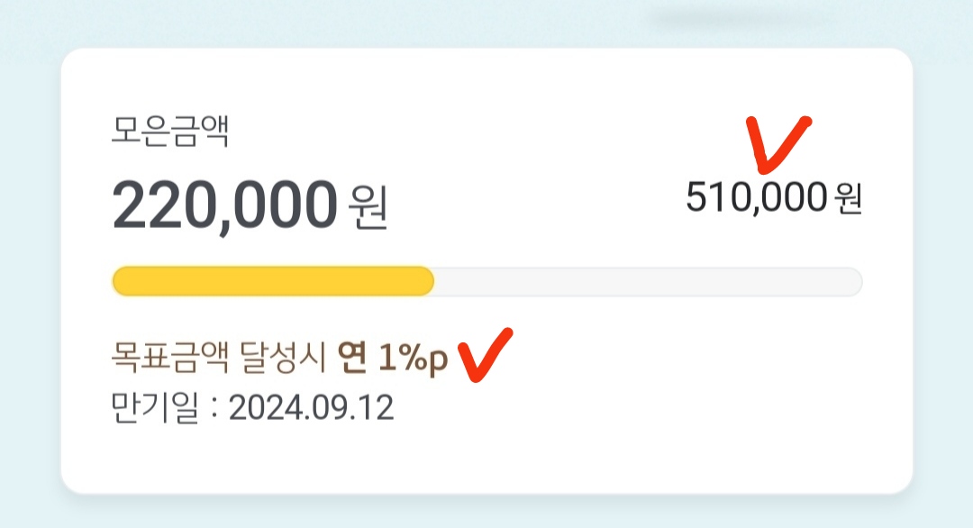50만원 이하면 0.5%이고, 50만원 초과면 1%기 때문에 조금이라도 금리를 더 받고 싶으신 분들은 목표금액을 50만을 초과해서 설정하시면 돼요.