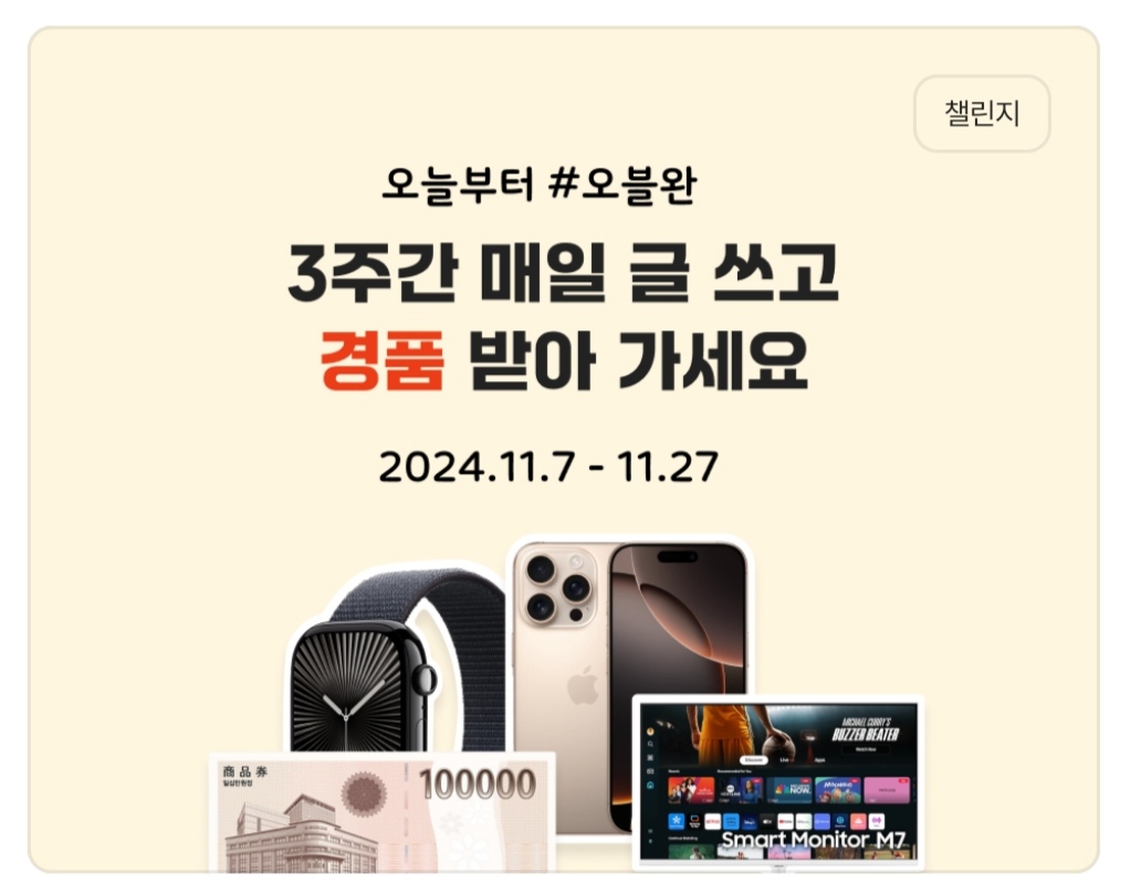 저는 이미 기회를 날렸지만 7일부터 참여하신 분들은 마지막까지 완주해서 스마트모니터 M7(8명), 애플워치 10(4명), 아이폰 16Pro(1명)의 주인공이 될 수 있는 기회를 획득하시길 바랍니다.