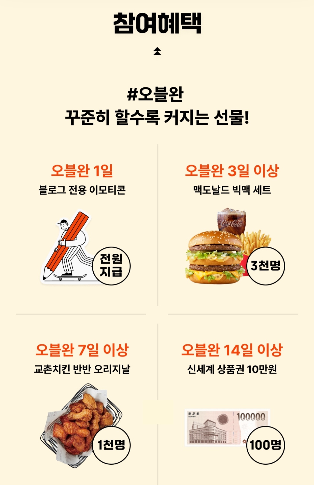 1일 참여하면 전원 블로그 전용 이모티콘을, 3일 이상 참여하면 3천명 추첨해서 맥도날드 빅맥 세트를, 7일 이상 참여하면 1천명 추첨해서 교촌치킨 반반 오리지날을, 14일 이상 참여하면 100명 추첨해서 신세계 상품권 10만원을 준다고 하니까 지금부터라도 열심히 해봐요!
