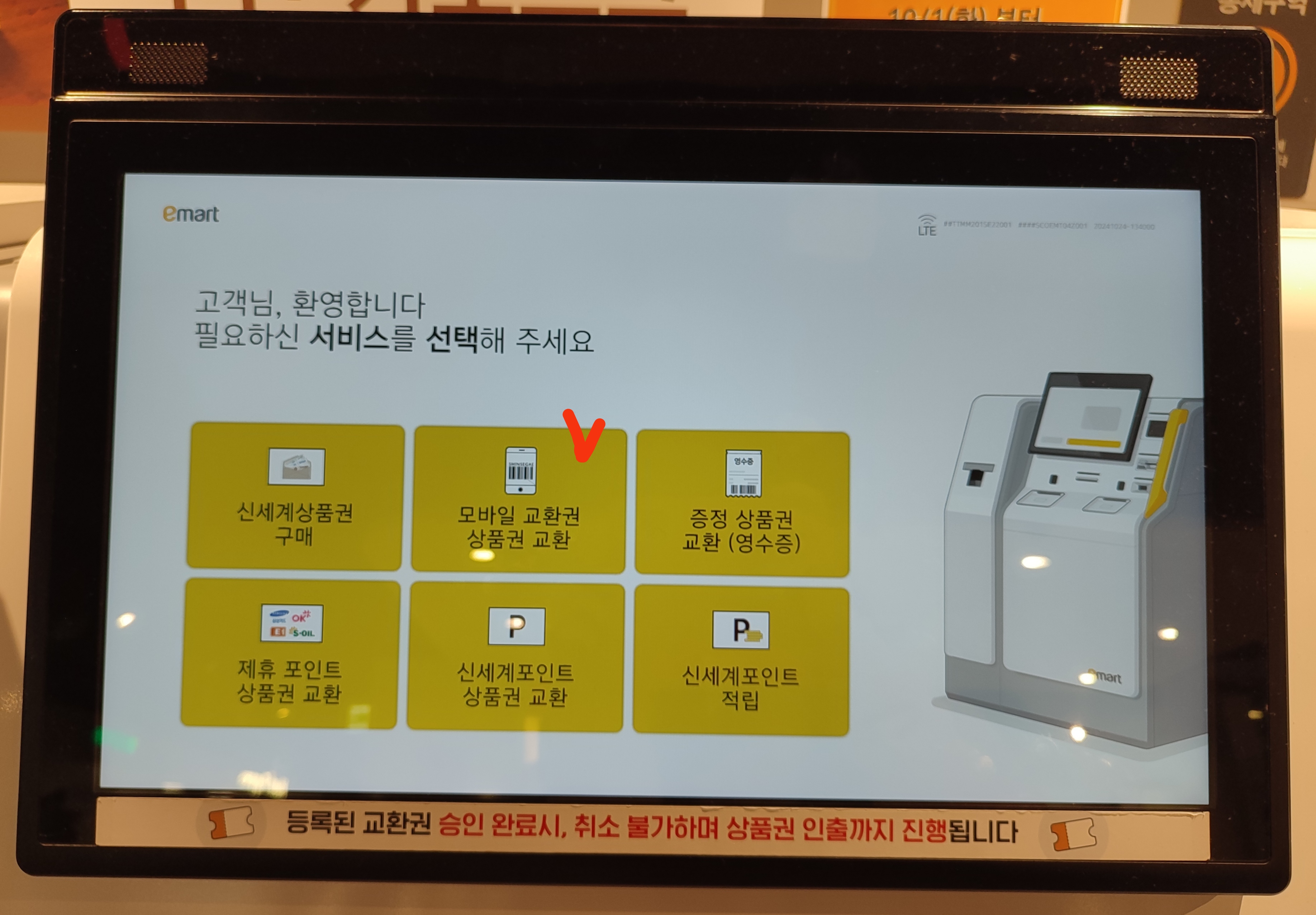신세계상품권을 이마트에서 지류상품권으로 교환하는 법은 간단해요. '신세계상품권 무인 키오스크'를 찾아서 앞으로 가셔서 아래 절차를 따라주시면 됩니다.