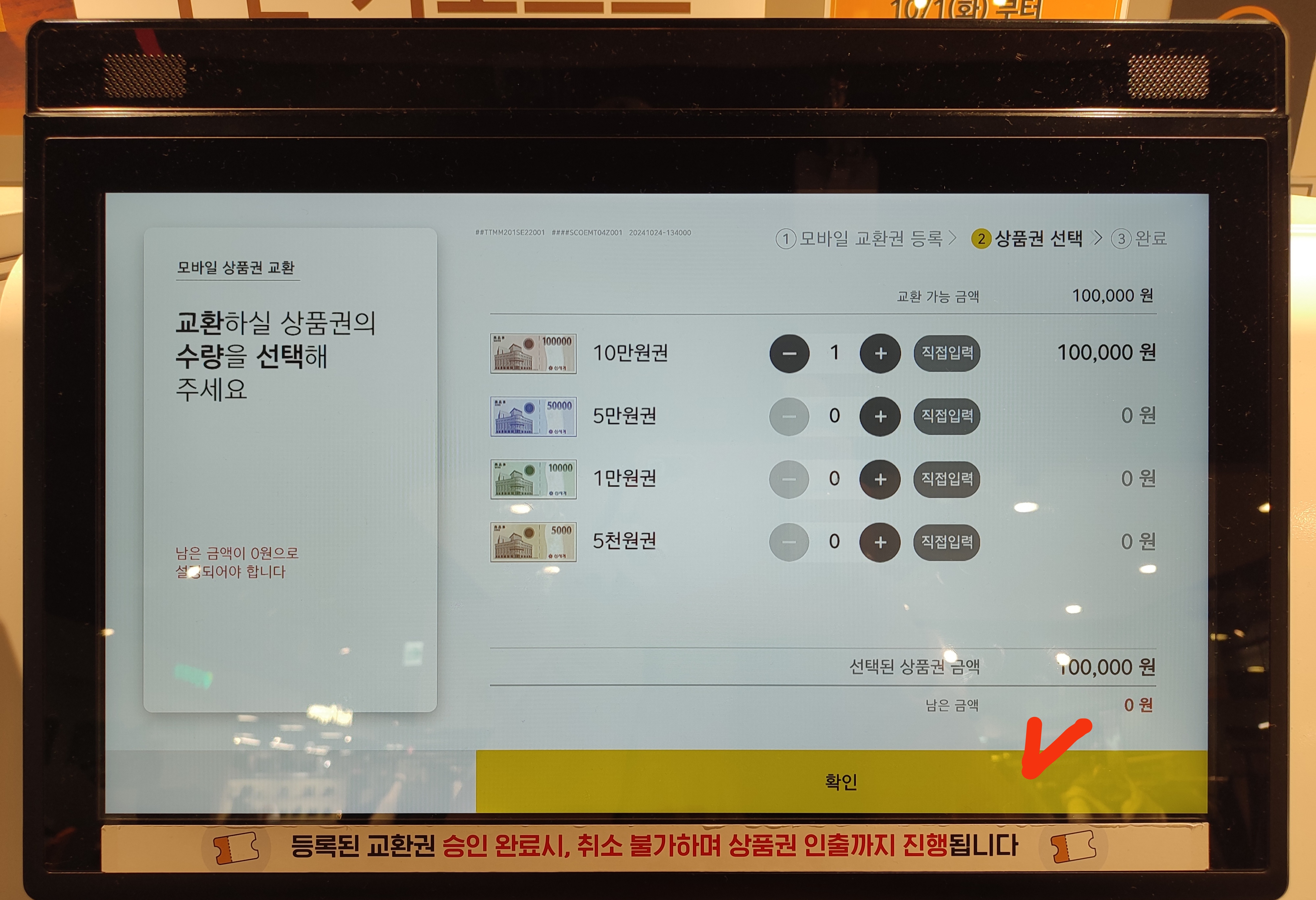 5. 교환하실 상품권의 종류와 수량을 선택해주세요. 저는 10만원권 1장을 등록해서 10만원권으로 받았지만, 5만원권 2장 또는 1만원권 10장, 5천원권 20장으로 받으셔도 돼요.
