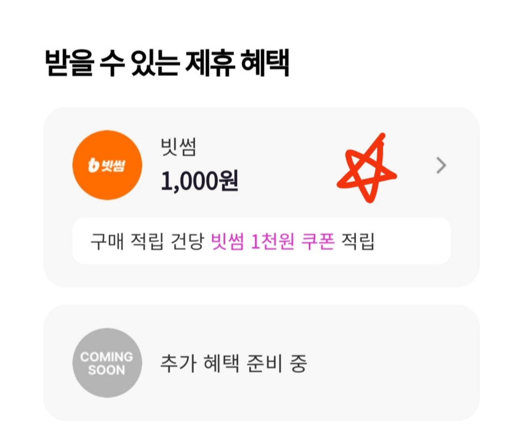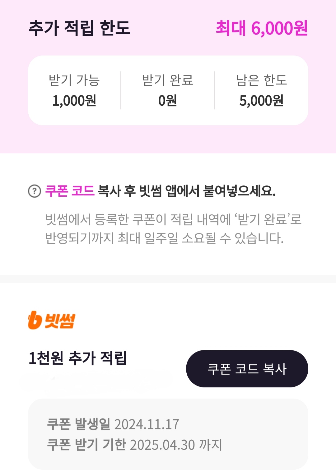 4. 상단에는 받기 가능한 금액, 받기 완료한 금액, 남은 한도가 표시되는데, 받기 완료한 금액은 추후 표시되므로 무시하시고 받기 가능한 금액과 남은 한도만 확인하시면 돼요. 그리고 하단에 '1천원 추가 적립' 쿠폰 코드를 복사해서 빗썸에서 등록해주세요.
