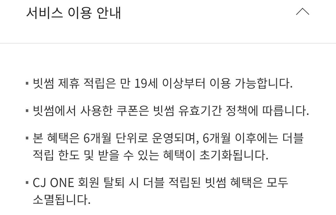 참고로 빗썸 제휴 적립은 만 19세 이상부터 이용 가능하며, CJ ONE 회원 탈퇴 시 빗썸 혜택도 소멸되므로 유의해 주세요.