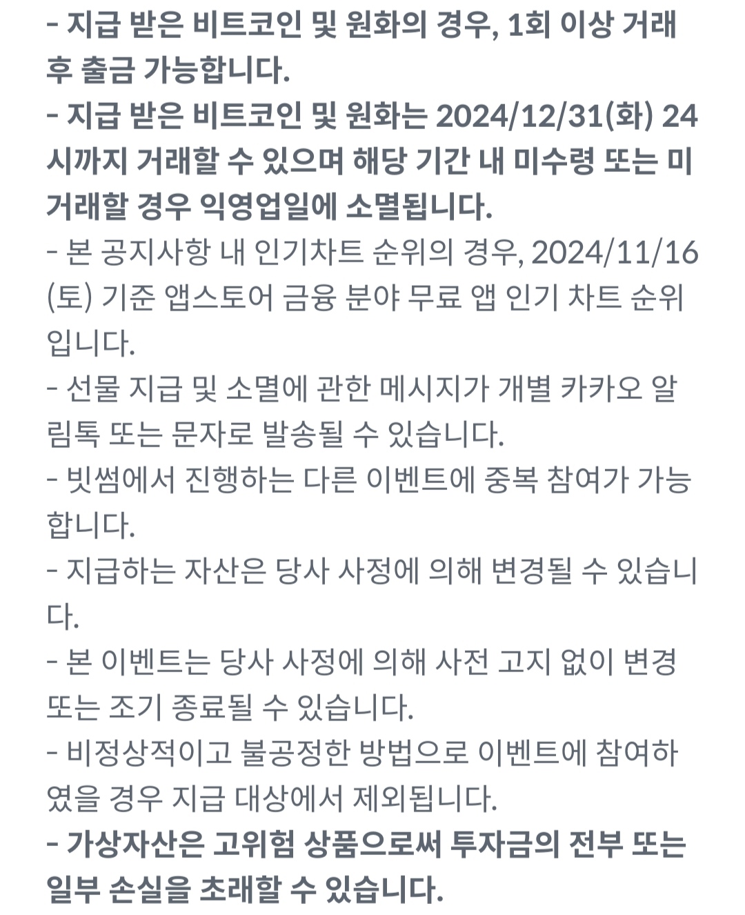 자세한 내용은 빗썸 앱 내 [더보기] - [이벤트] 항목에서 해당 이벤트를 찾아 확인해보세요.