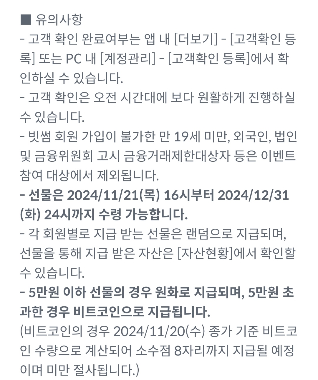 선물은 랜덤으로 최소 5천원에서 1억 상당의 비트코인 또는 원화로 지급된다고 하는데, 5만원 이하는 원화로 5만원 초과는 비트코인으로 지급되며, 비트코인과 원화 모두 1회 이상 거래 후 출금 가능하다고 하니 유의해 주세요.