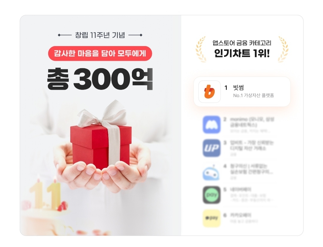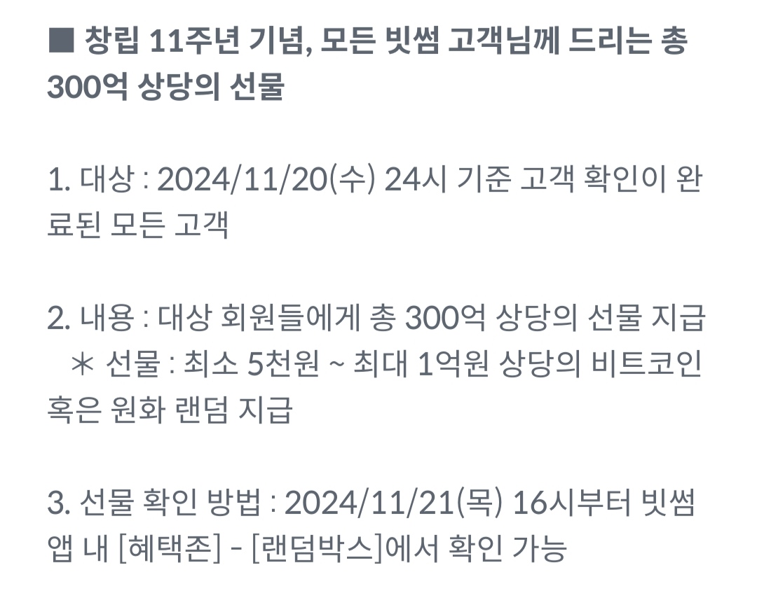 빗썸 창립 11주년 기념 300억 상당 선물 제공 대상자는 2024년 11월 20일 24시 기준 고객 확인이 완료된 모든 고객들로 내일(11월 21일) 오후 4시부터 선물 확인이 가능해요.