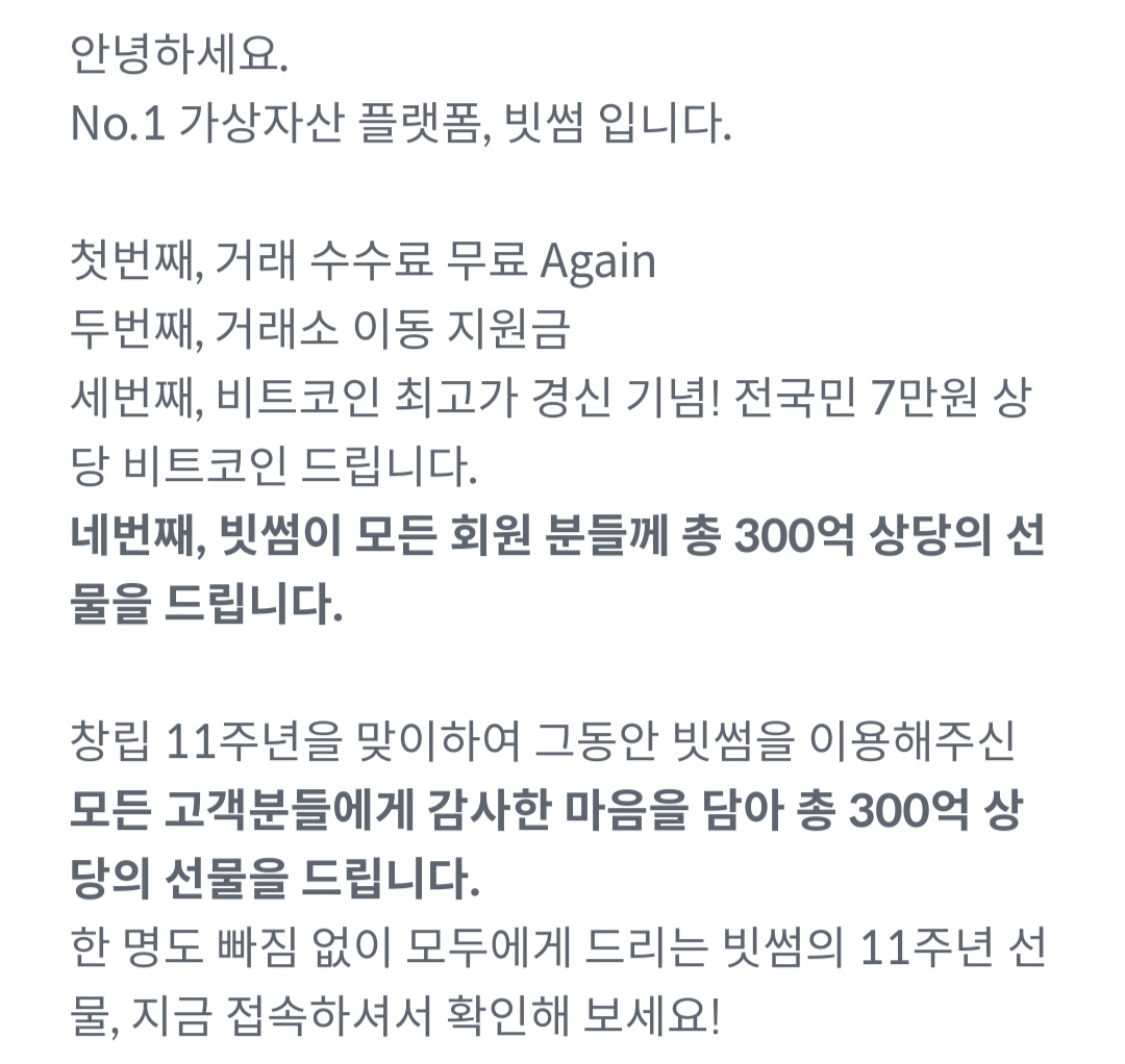 내일 빗썸에서 창립 11주년 기념으로 모든 회원에게 300억 상당하는 선물을 제공, 비트코인 또는 원화를 준다고 해서 말이죠. 비트코인 받으면 함께 매도할 생각인데, 내일까지 현 시세 유지해줬음 제발~~!! ㅋㅋ