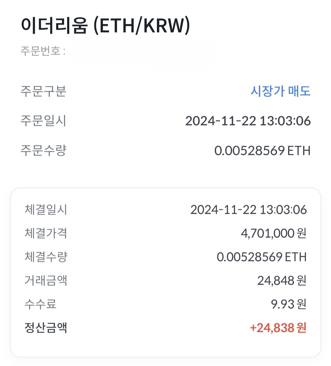 매도한 이더리움은 0.0052869ETH이고, 체결 가격은 4,701,000원, 수수료는 9.93원, 최종 거래 금액은 24,848원으로 극소량입니다만?? ㅋㅋㅋ