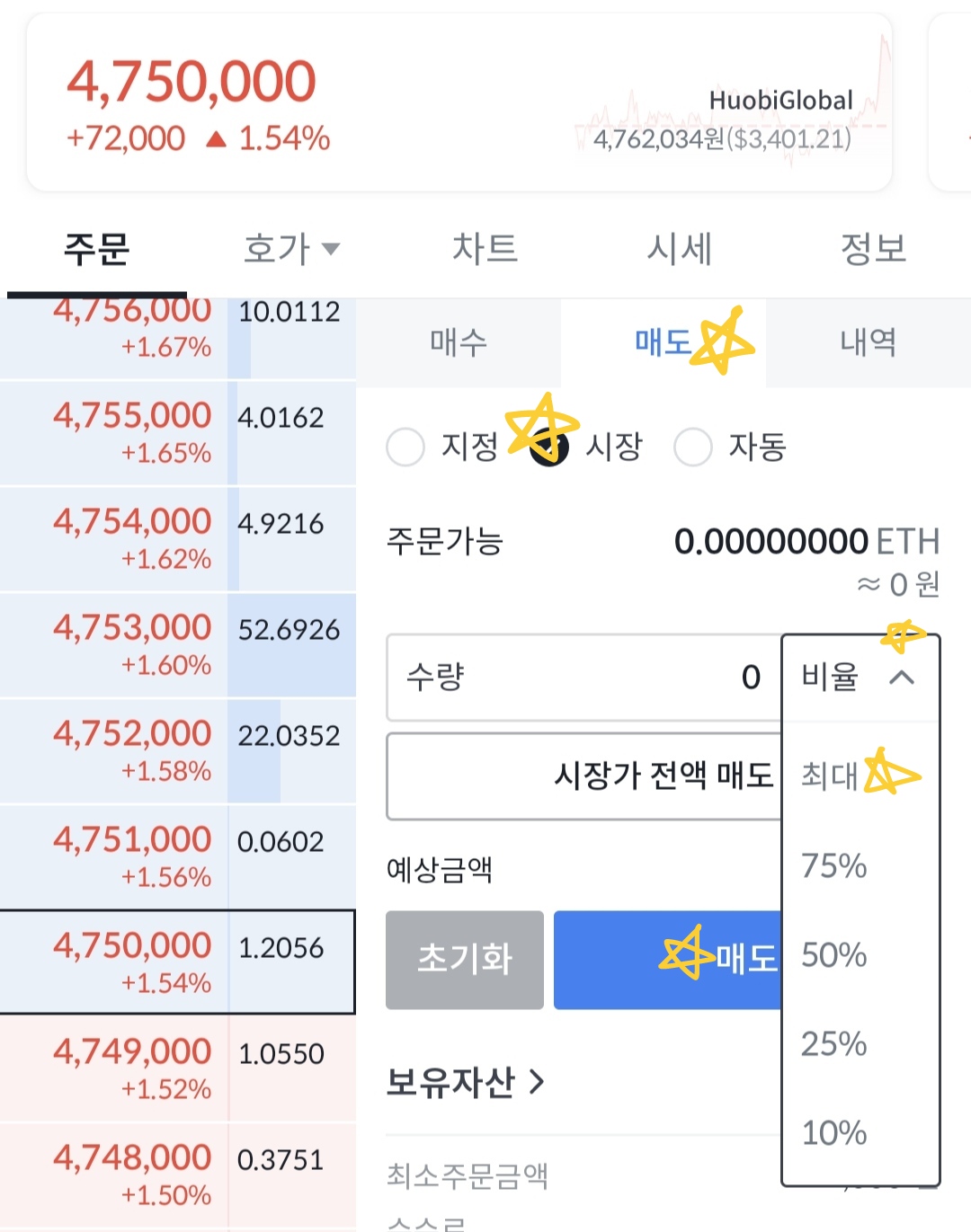 이더리움이나 비트코인이나 매도 방법은 같아요.
