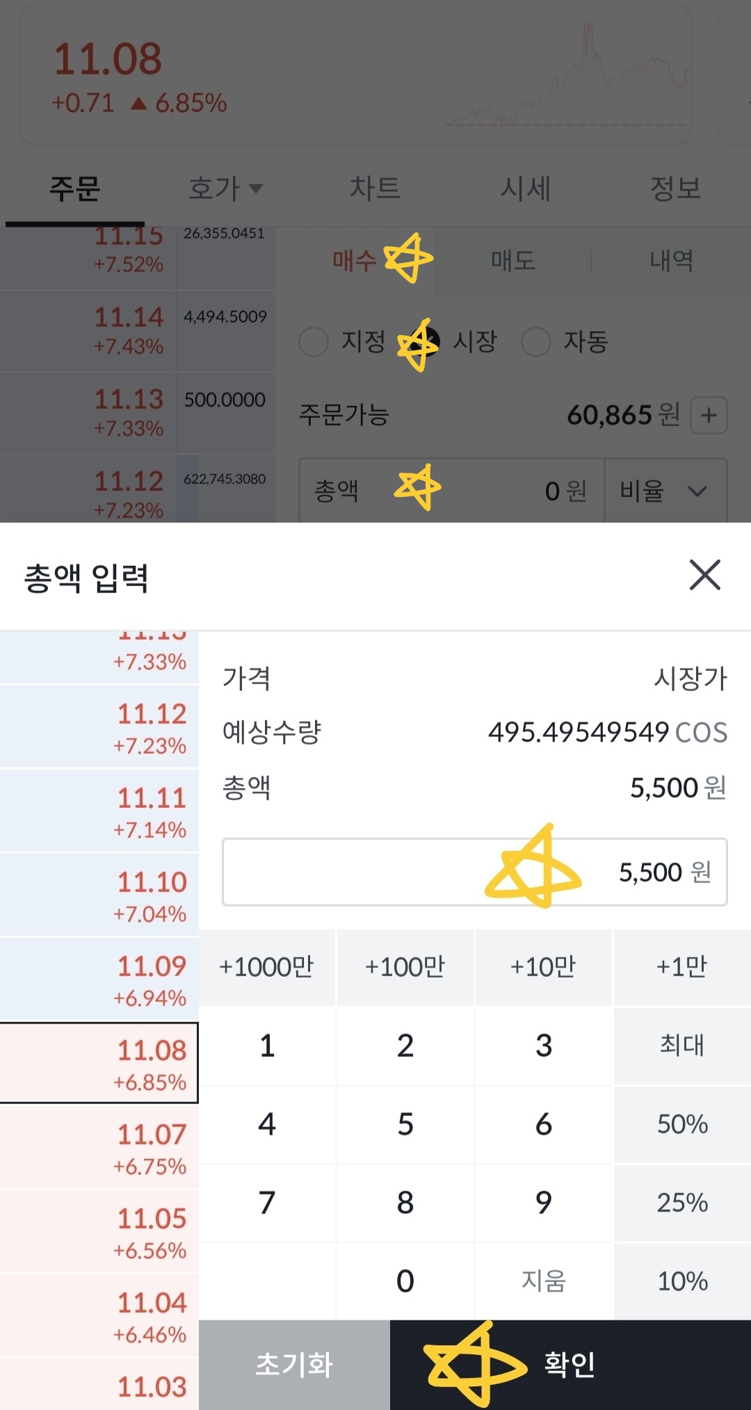2. 주문창에서 '매수'를 클릭 ---> '시장'을 선택한 다음 총액 창을 클릭 ---> 매수할 금액을 입력 한 다음 '확인' 버튼을 클릭합니다. 매수창으로 돌아와 '매수' 버튼을 누르면 매수가 완료됩니다.