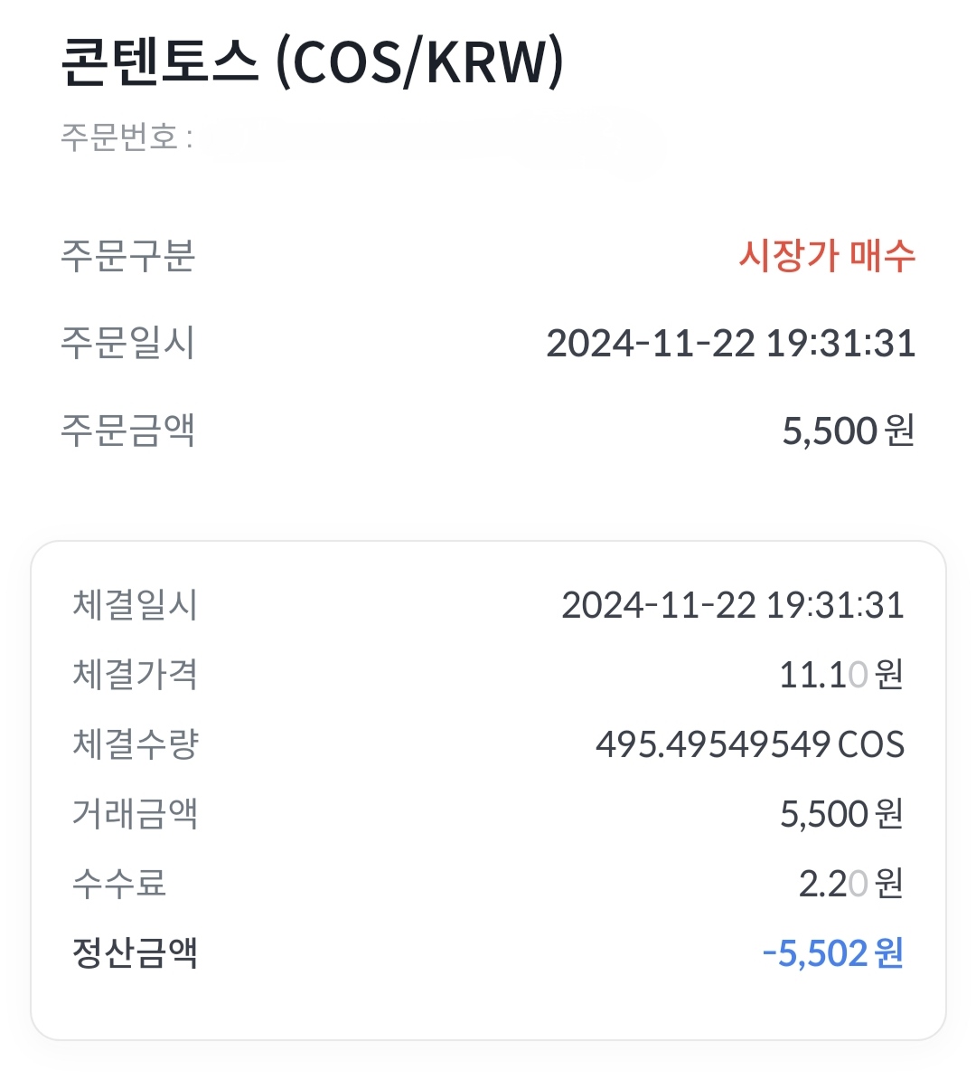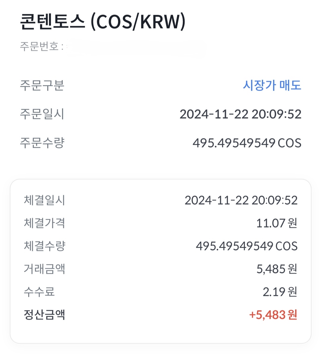 그것도 매수한 다음 바로 매도하지 않고 매수했을 때와 같은 금액으로 매도하려고 기다렸다가 자꾸 떨어져서 혈압 올라 죽는 줄 알았네요. 11.05원일 때 매수하려다가 잠시 고민하는 사이 놓쳤더니 이후 계속 오르길래 조금 떨어진 11.08원일 때 매수 버튼을 눌렀는데, 11.10원으로 체결! 이후 다시 11.10원 되기 기다렸으나 이번엔 반대로 계속 떨어지더라는.....ㅜㅜ 와~ 사람 가지고 노는 줄... 어차피 십원 단위 손해인 거 걍 팔자 하고 11.09원일 때 매도했는데 실제는 11.07원으로 체결됐네요.ㅜㅜ 시장가를 선택해서 그런지 제가 주문창에서 본 금액보다 매수는 높게 매도는 낮게 체결이 되는 것 같더라고요.