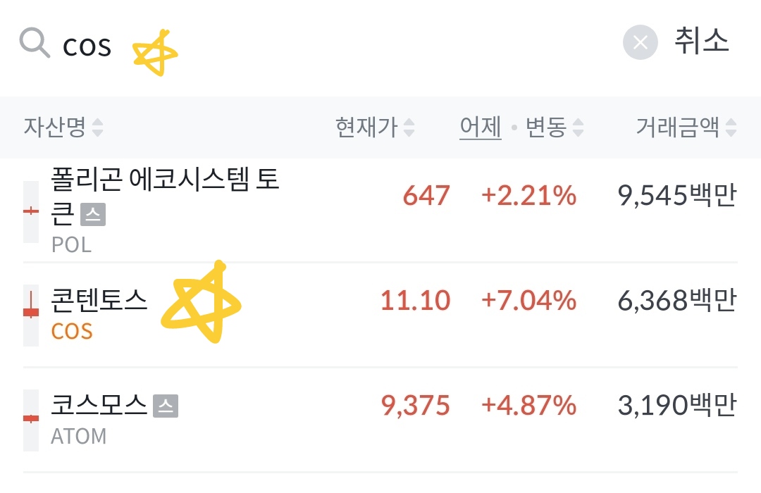 1. 빗썸 앱 하단 목록 중 '거래소' 내 검색창에서 '콘텐토스' 또는 'COS'를 검색한 다음 해당 코인을 클릭해주세요.