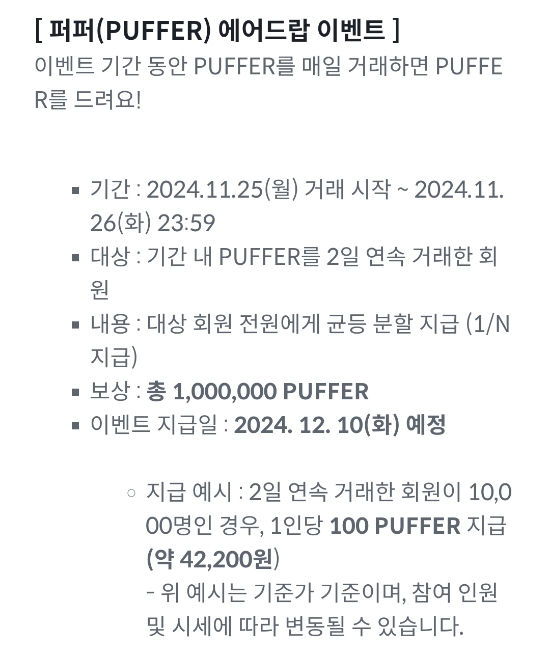 퍼퍼(PUFFER)의 보상금은 총 1,000,000PUFFER로 2일 연속 거래한 회원이 10,000명인 경우 1인당 100PUFFER 지급으로 약 42,200원이라니 꽤 높네요. 이것도 최소 25PUFFER, 약 10,000원 초반대 예상해 봅니다.^^
