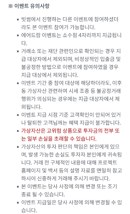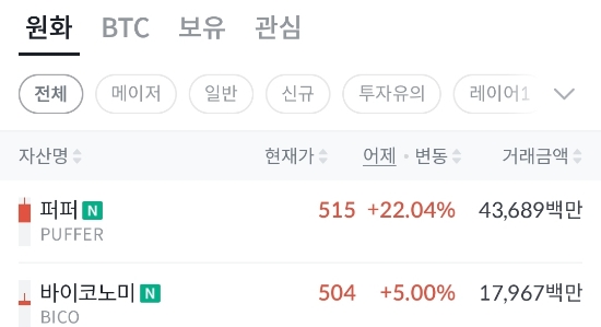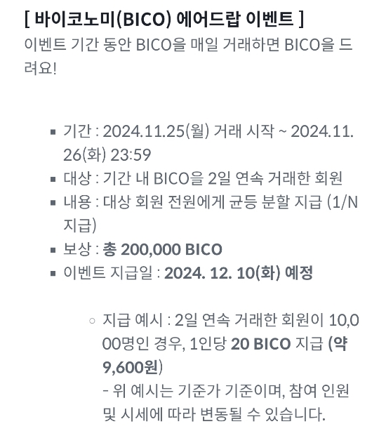 현재 빗썸에서 바이코노미(BICO), 퍼퍼(PUFFER) 원화 마켓 신규 추가 기념으로 에어드랍 이벤트 중이에요. 각각 11월 25일, 26일 2일 연속 거래한 회원에게 보상금을 1/N 지급한다고 하니 아래 상세 내용 확인해 보시고 관심있으시면 참여해 보세요!