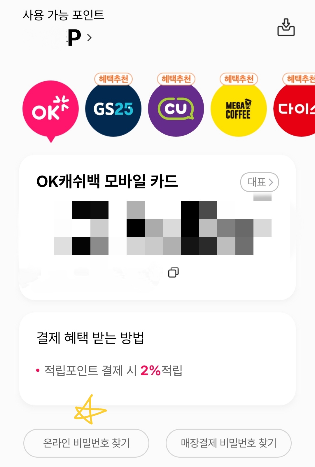 3. 오케이캐쉬백 모바일 카드 바코드 아래 '온라인 비밀번호 찾기' 버튼을 클릭합니다.