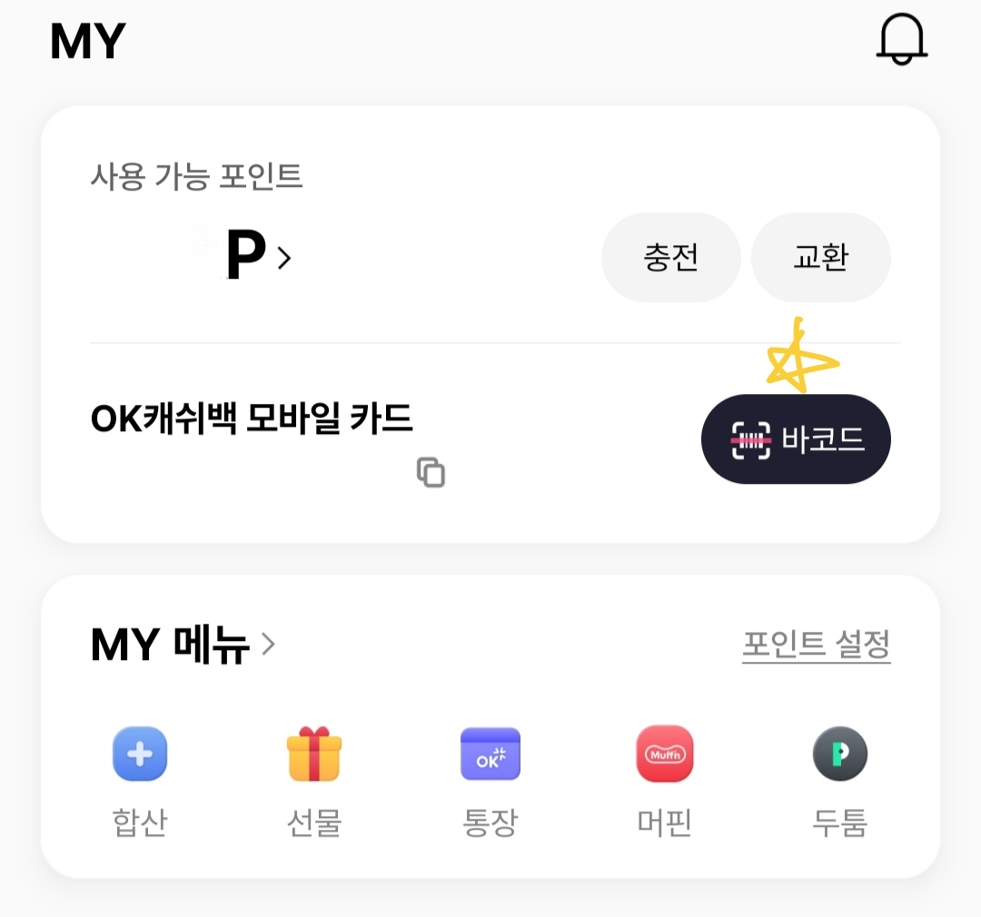 2. 오케이캐쉬백 모바일 카드 옆 '바코드' 버튼을 클릭합니다.