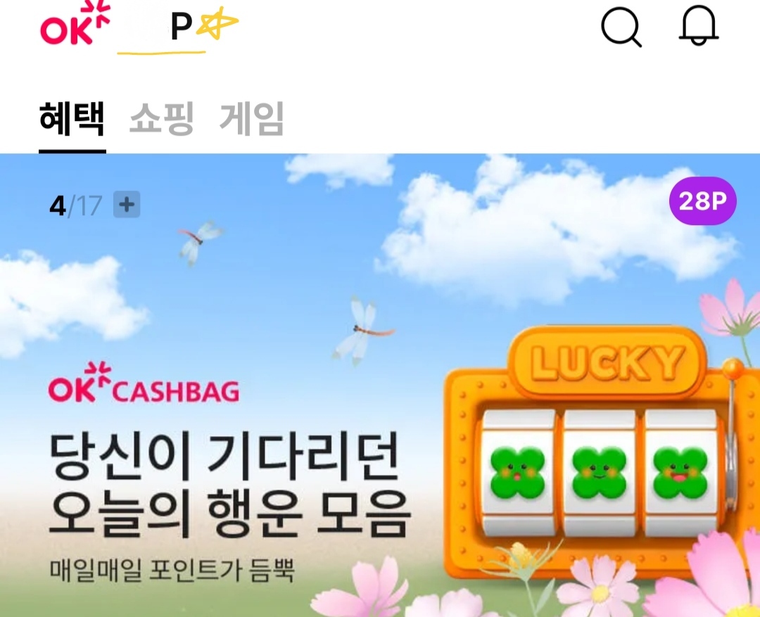 1. 본 설명은 오케이캐쉬백 앱 기준으로, 앱 첫 화면 상단에 나오는 오케이캐쉬백 포인트 금액을 클릭합니다.