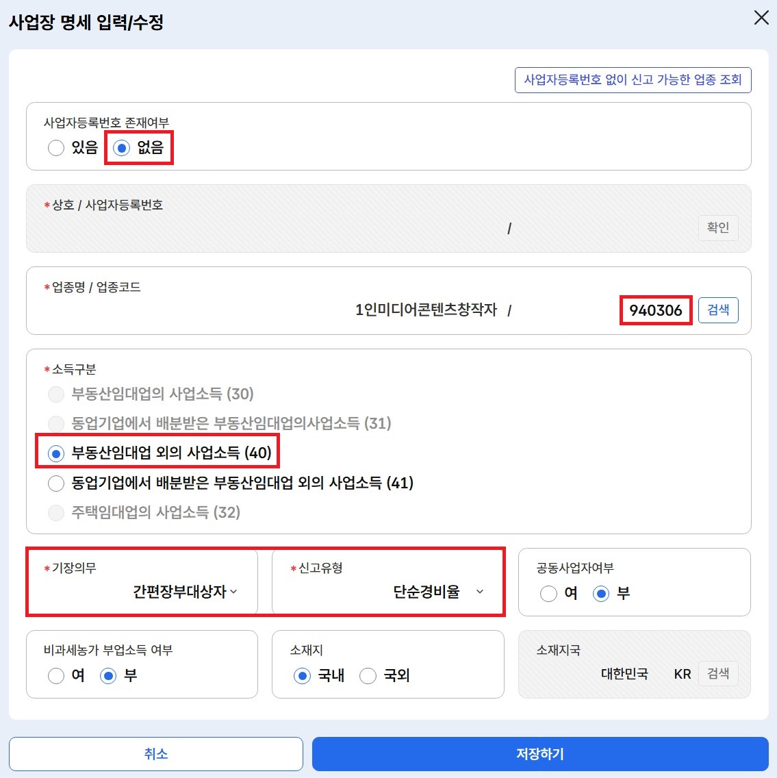940306의 경우 소득이 많으신 분은 사업자 등록을 하셨겠지만, 저는 소득액이 소소해서 하지 않았기에 사업자등록번호는 '없음'으로, 소득구분은 '부동산임대업 외의 사업소득(40)'으로, 기장의무는 '간편장부대상자'로, 신고유형은 '단순경비율'을 선택했어요.