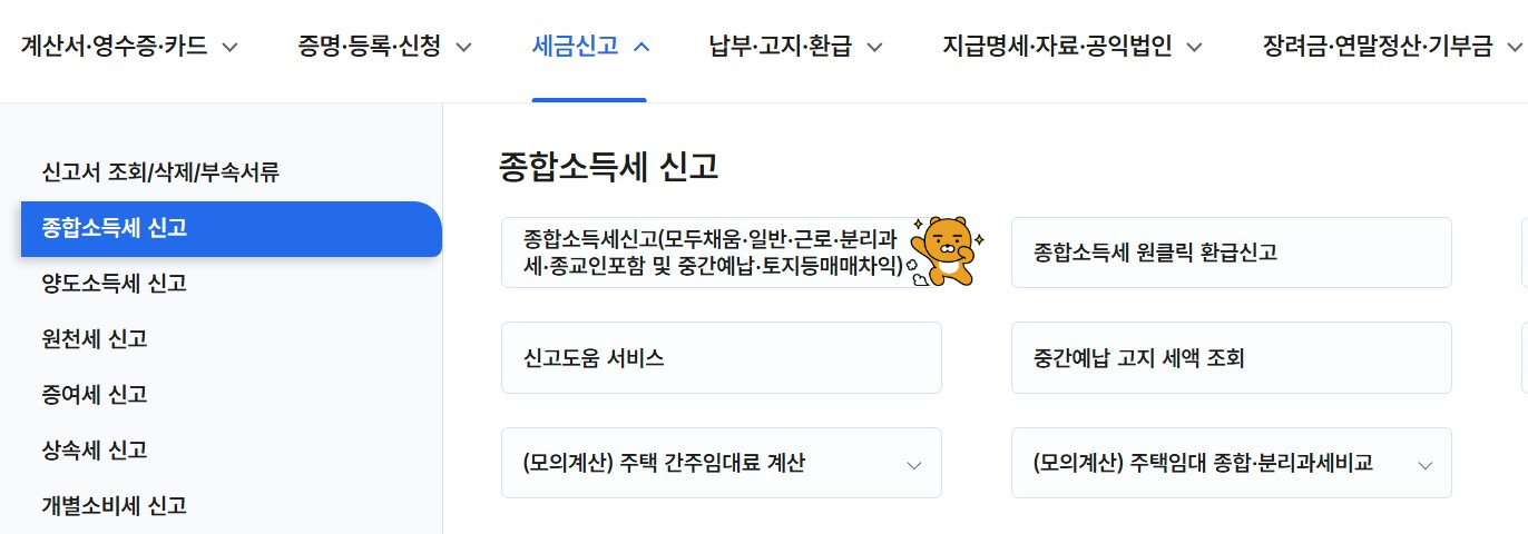 2. 홈텍스 메인에서 찾아갈 경우에는 '세금신고 --> 종합소득세 신고 --> 종합소득세 신고'를 클릭합니다.