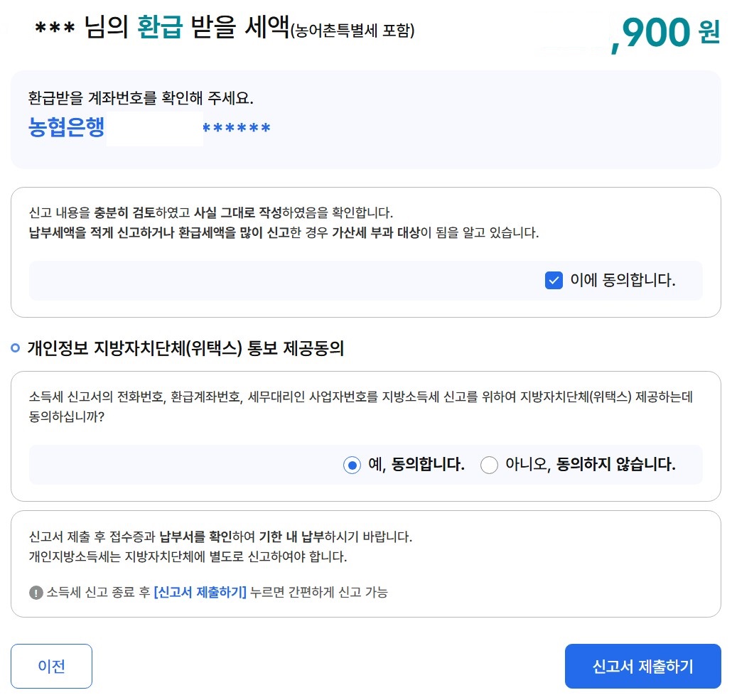 28. 환급받을 세액과 은행명, 계좌번호를 최종 확인하고, 모든 항목에 동의 후 '신고서 제출하기'를 클릭합니다.