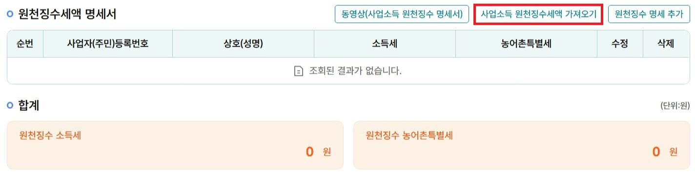 7. 원천징수세액 명세서 단계로 '사업소득원천징수세액 가져오기'를 클릭합니다.