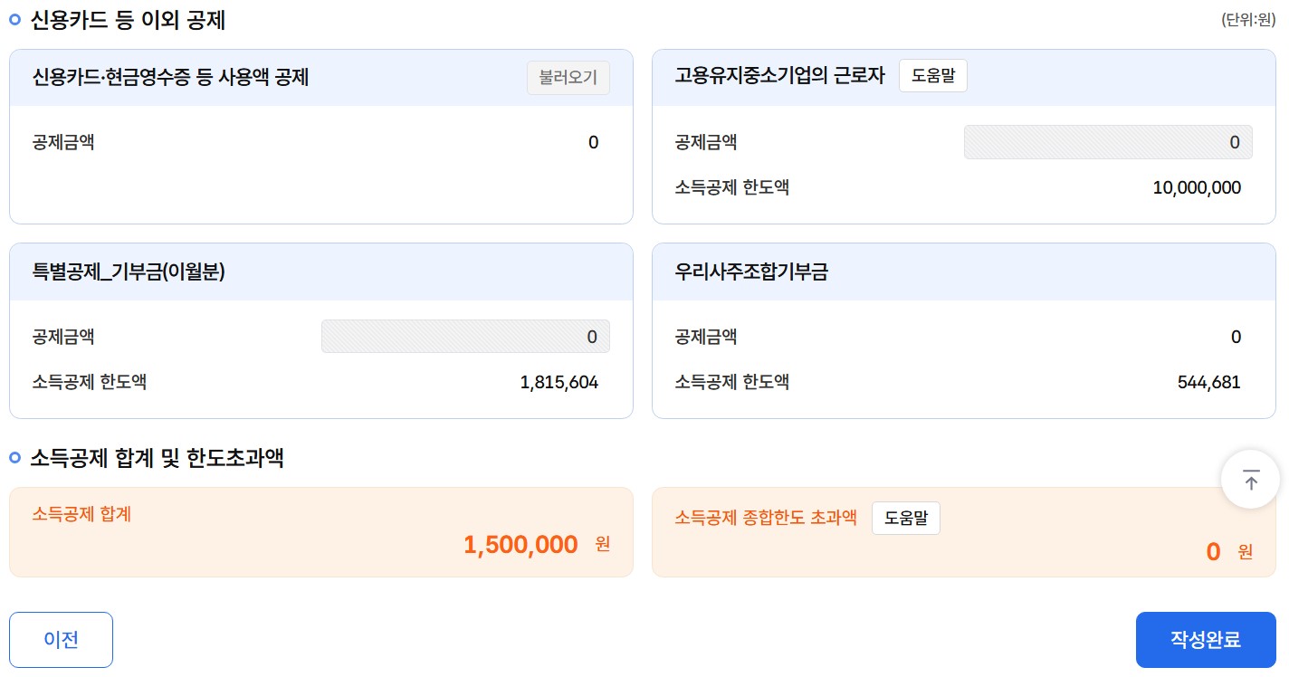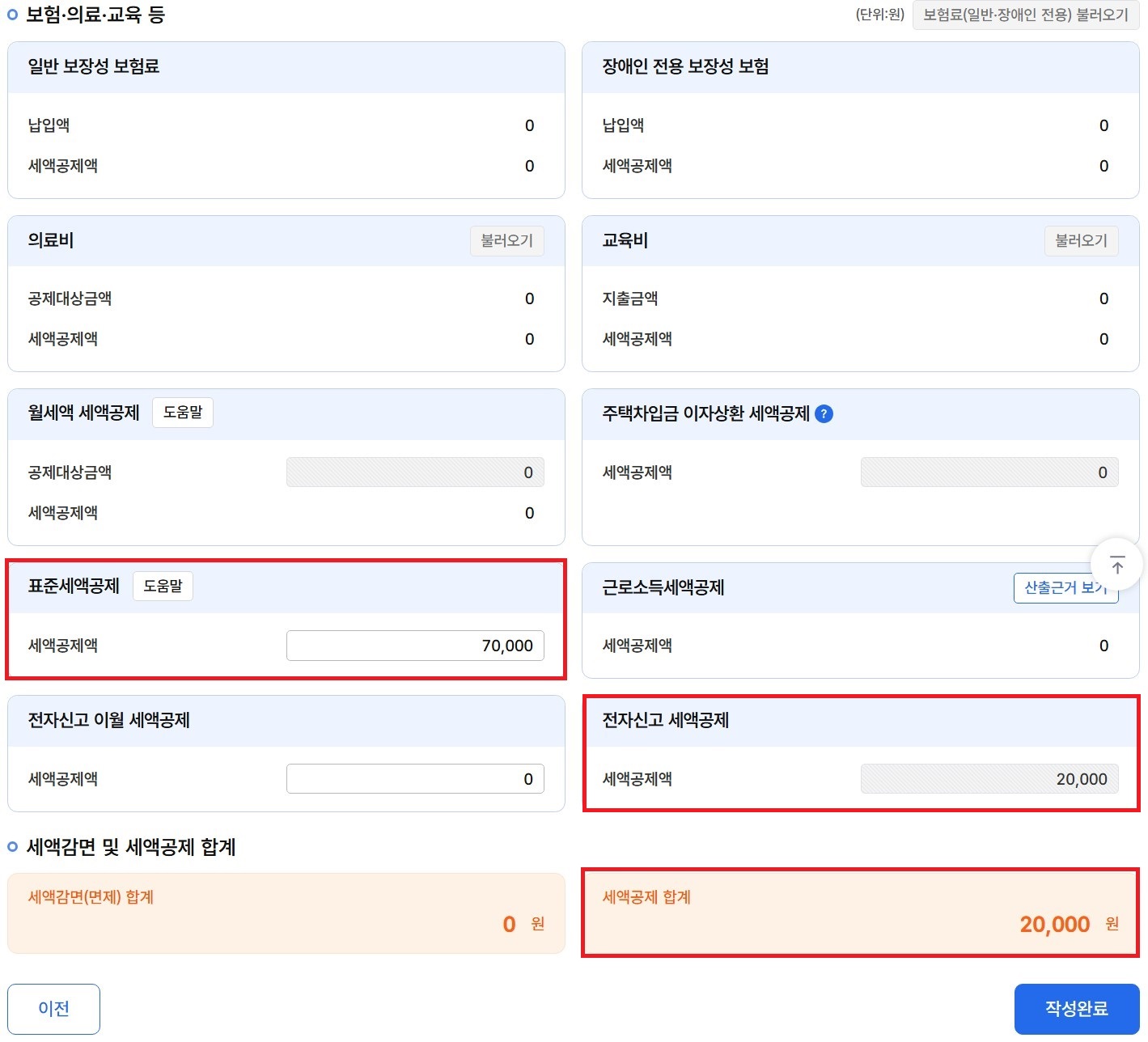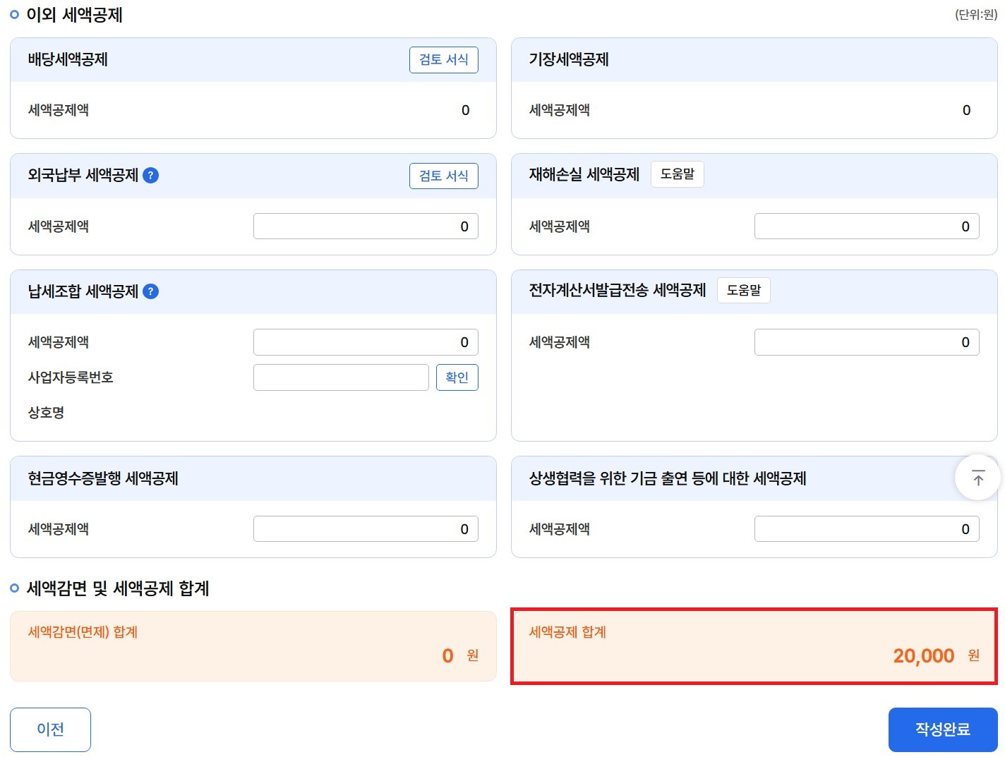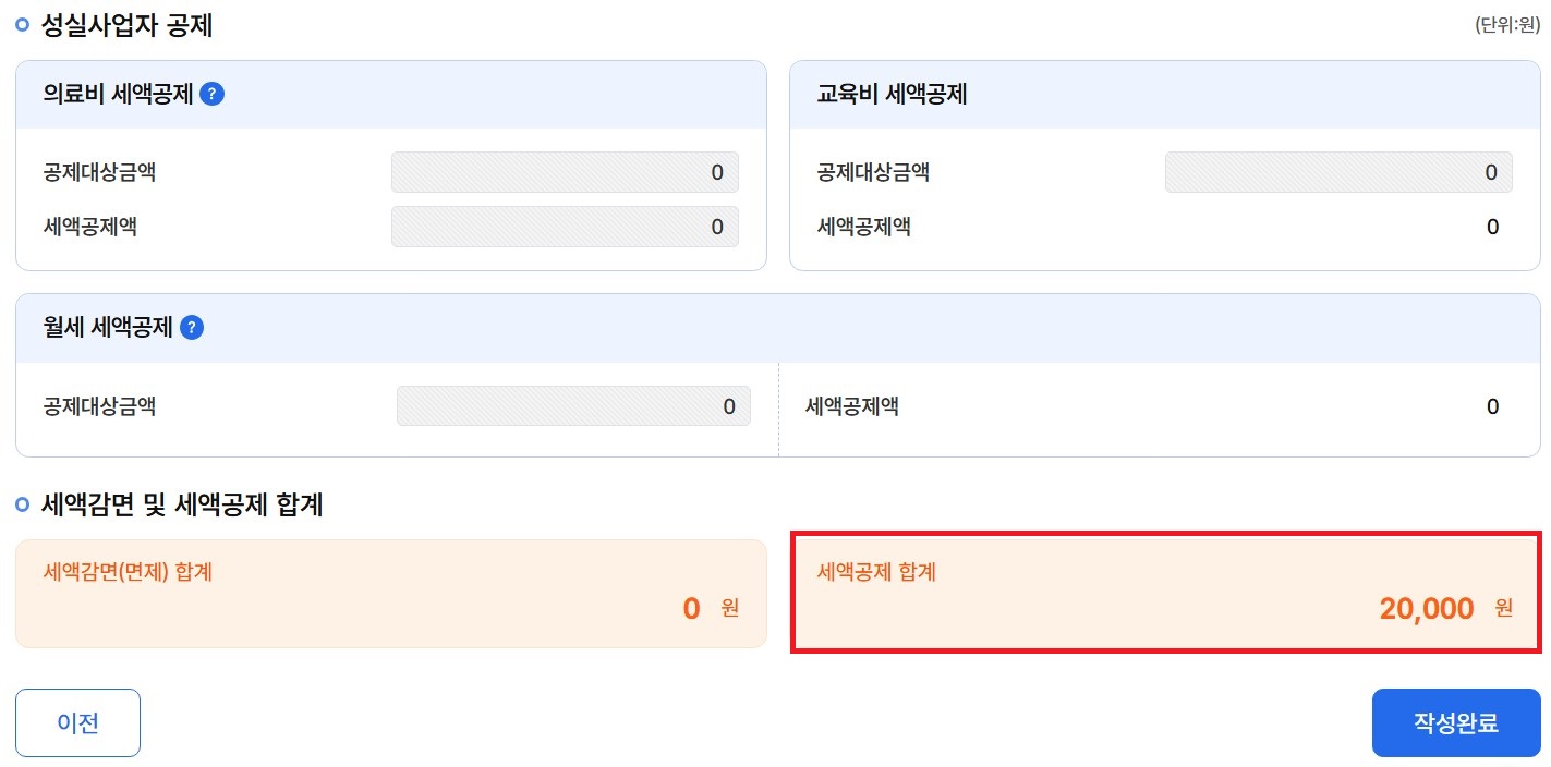 해당되시는 분들은 마지막 세액감면(면제) 합계와 세액공제 합계 금액을 확인 후 '작성완료'를 클릭합니다.