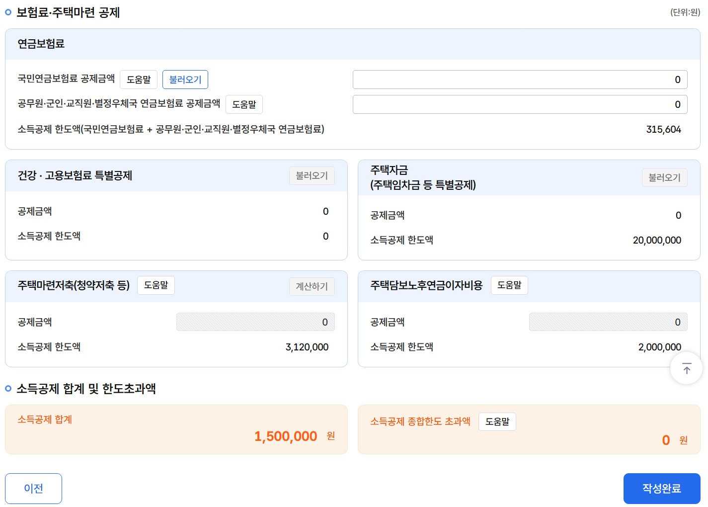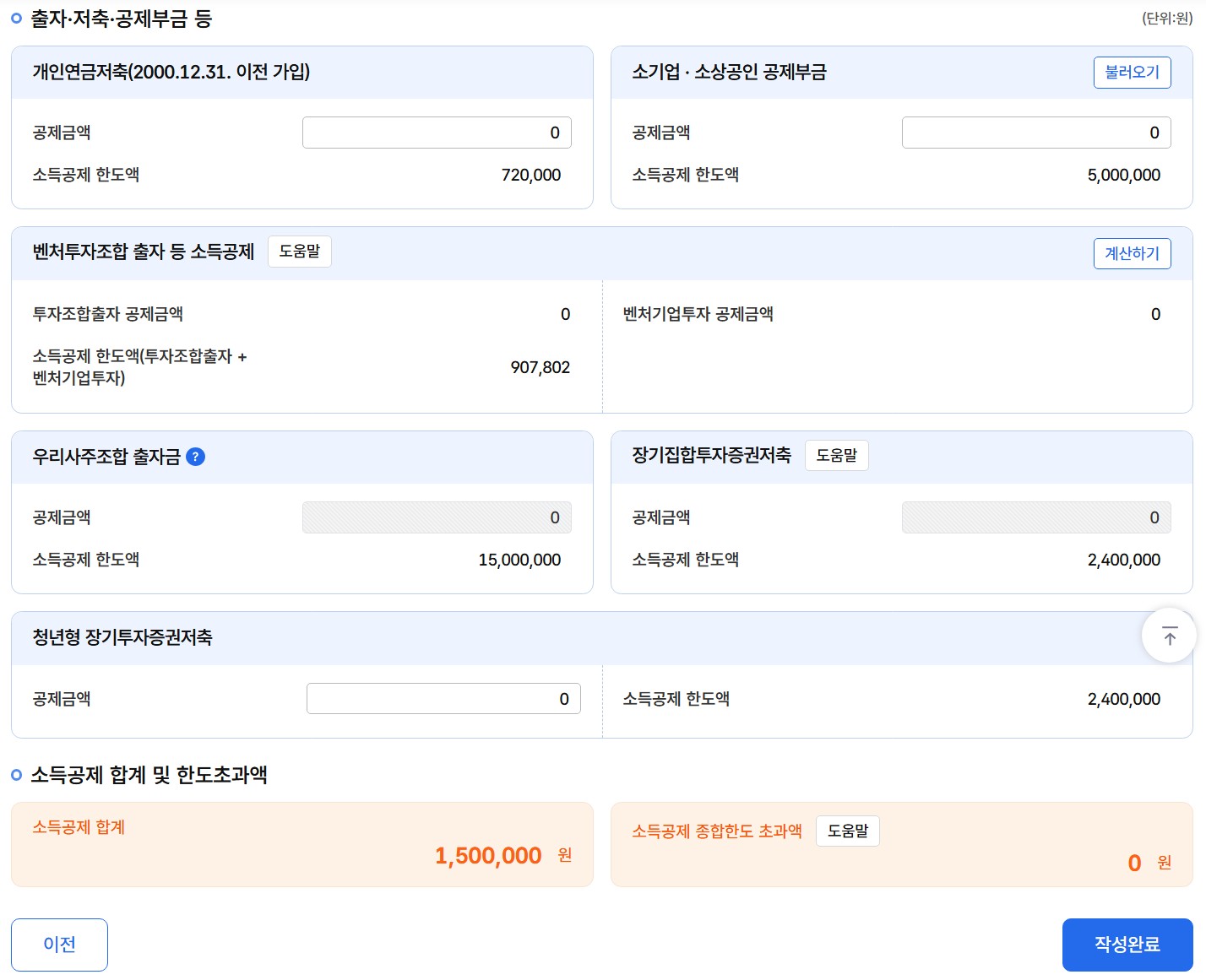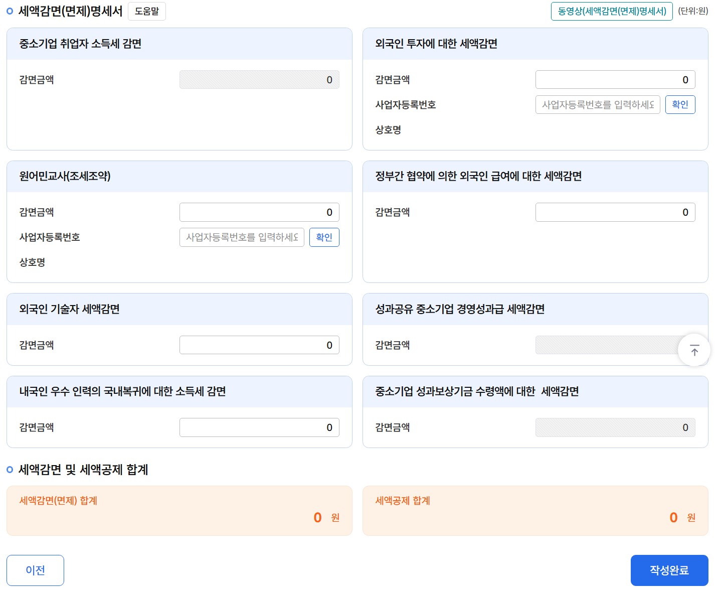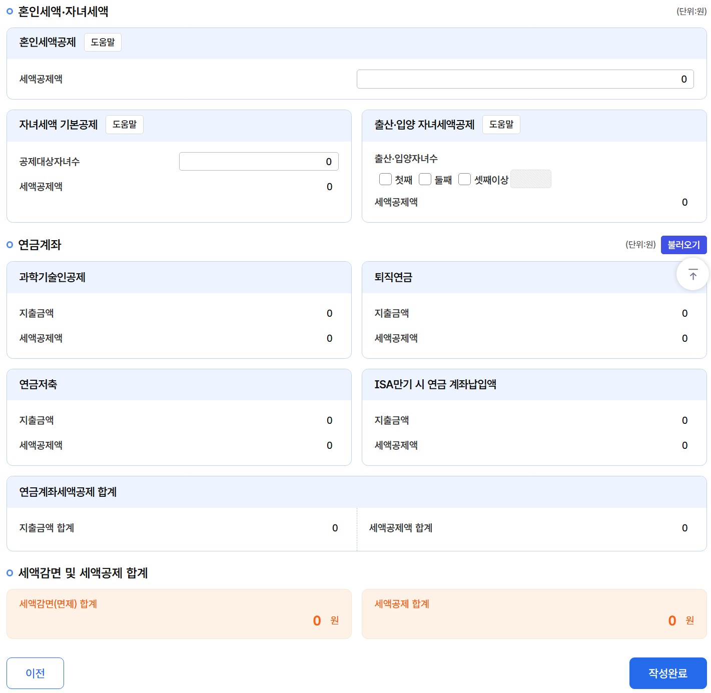 해당되시는 분들은 마지막 세액감면(면제) 합계와 세액공제 합계 금액을 확인 후 '작성완료'를 클릭합니다.