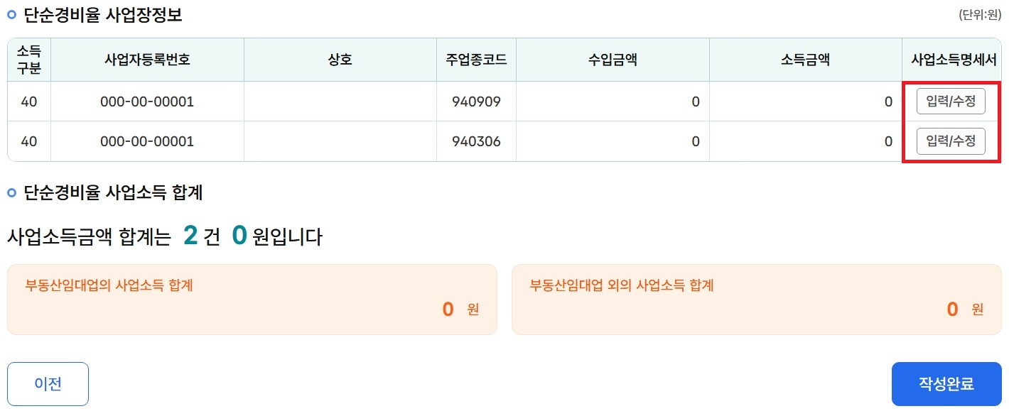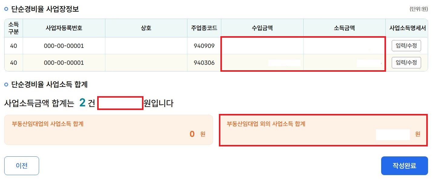 6-11. 사업장 별 수입금액과 소득금액을 확인하고, 총 합계를 확인한 다음 '작성완료'를 클릭합니다.