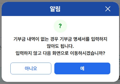 19. 기부금 내역이 있으신 분들은 기부금 명세서를 이어 진행하시고, 없으시다면 다음 화면으로 이동합니다.