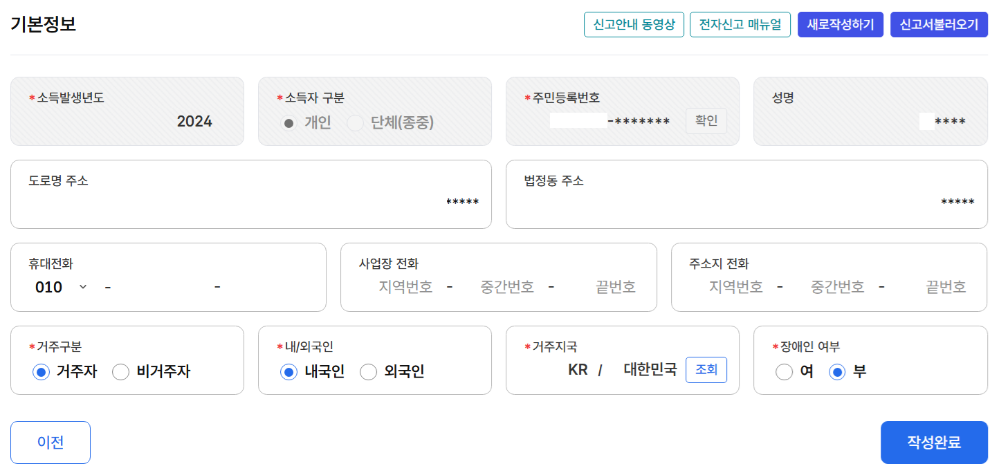 4. 주민등록번호 '확인'을 클릭하면, 자동으로 기본정보가 채워집니다. 맞으면 '작성완료' 버튼을 누릅니다.