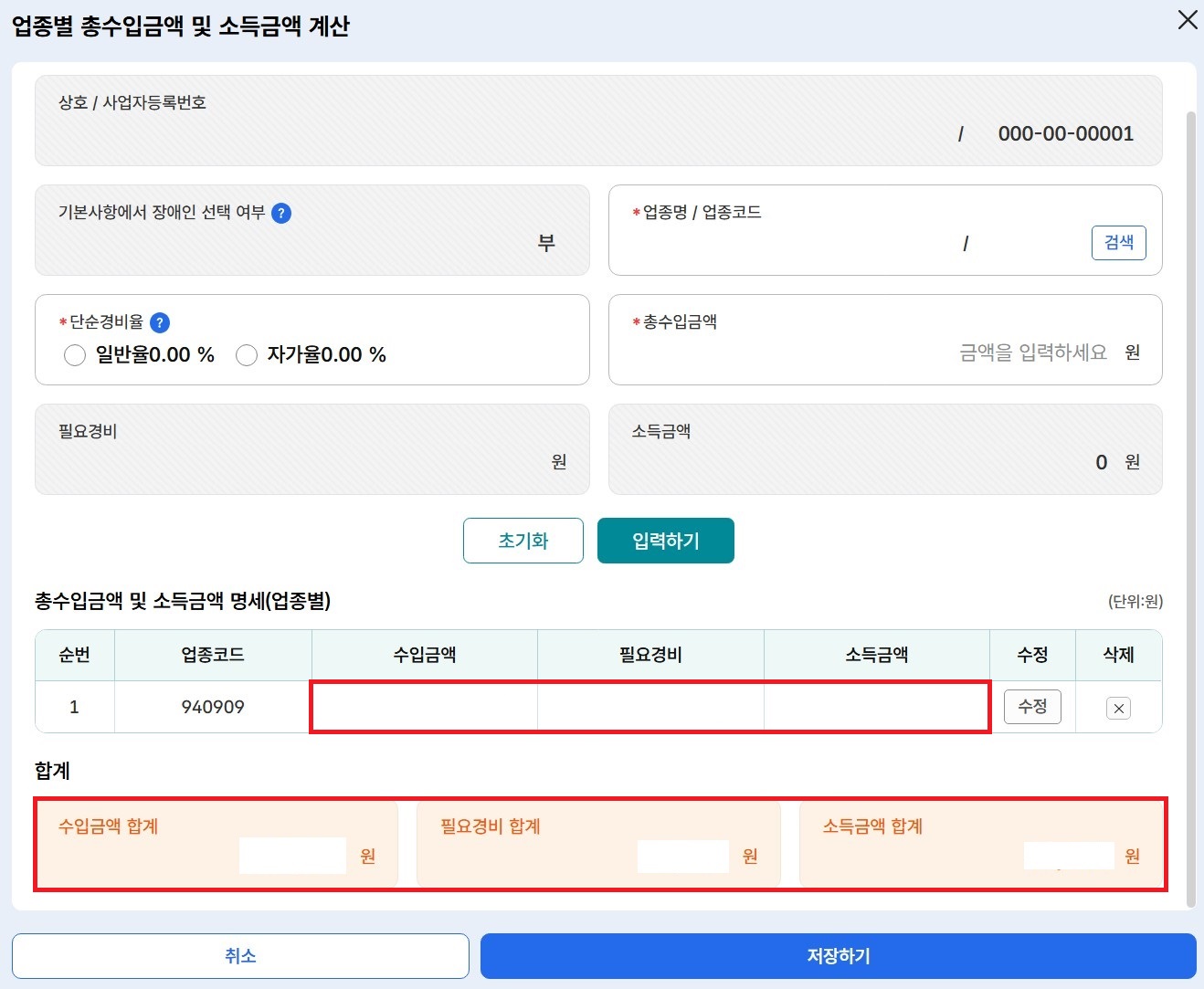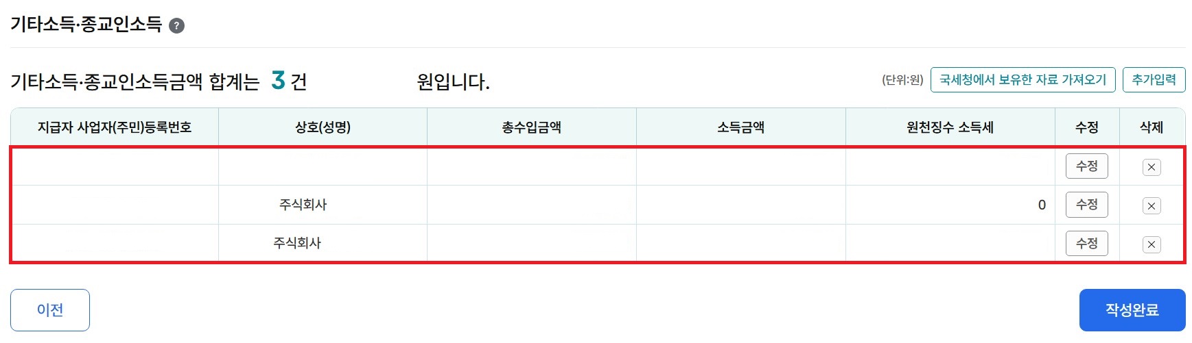 6-7. 소득금액을 계산하는 단계로 각 사업장의 '입력/수정'버튼을 클릭합니다.