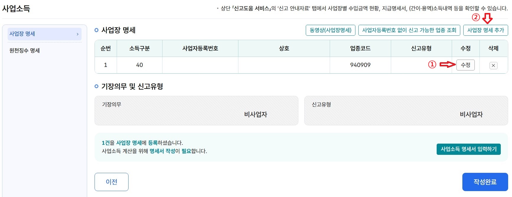 6-1. 위 사업소득 단계에서 목록에 신고해야 할 사업장이 뜬다면 '수정'을, 아무것도 뜨지 않거나 목록에 있는 사업장 외에 더 신고해야 할 사업장이 있다면 '사업장 명세 추가'를 클릭하여 추가해 줍니다.