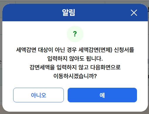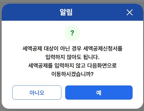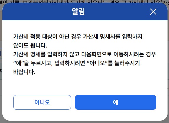 24. 가산세 적용 대상자는 가산세 명세서를 이어 진행하시고, 아니시면 '예'를 클릭 후 다음으로 넘어갑니다.
