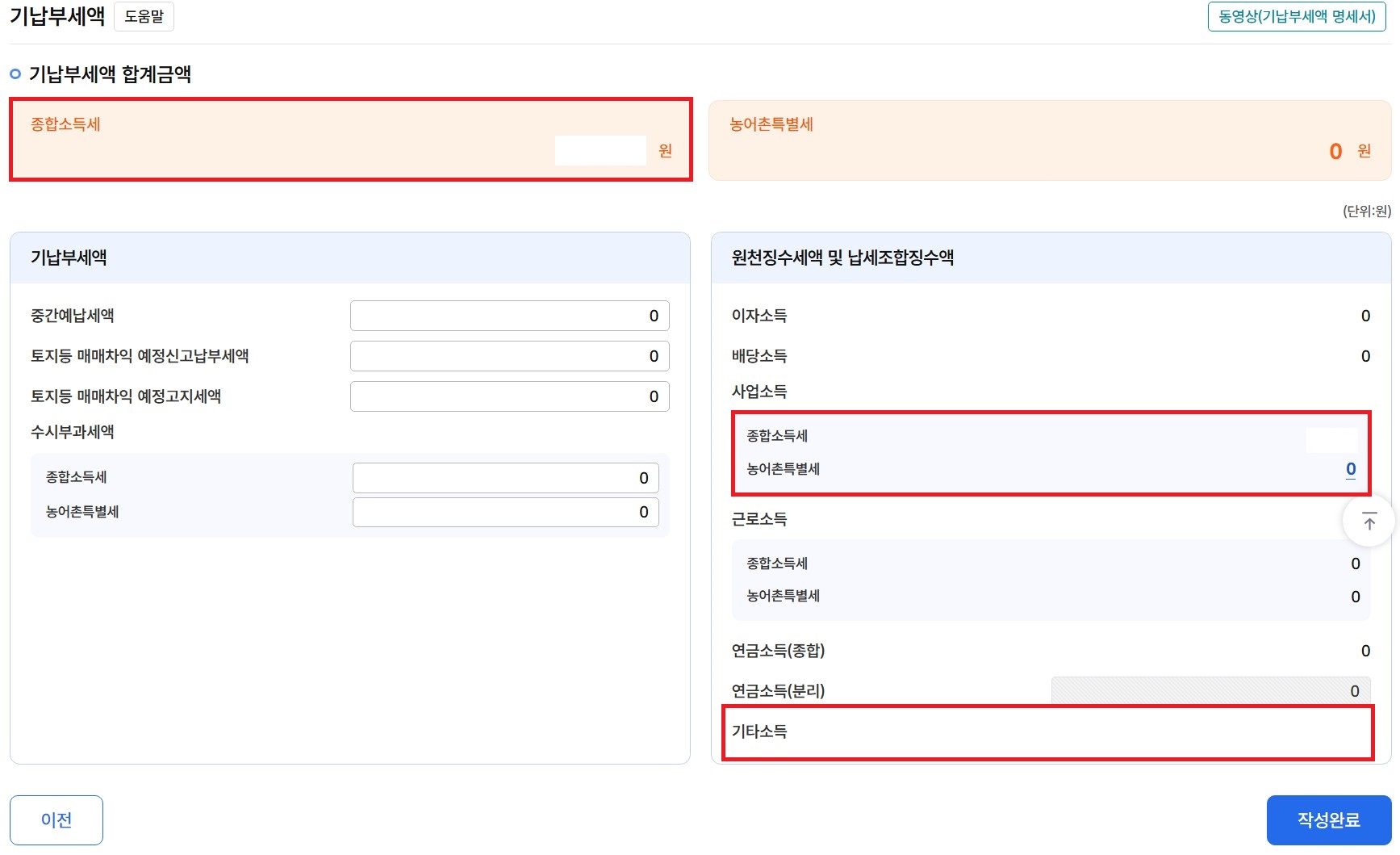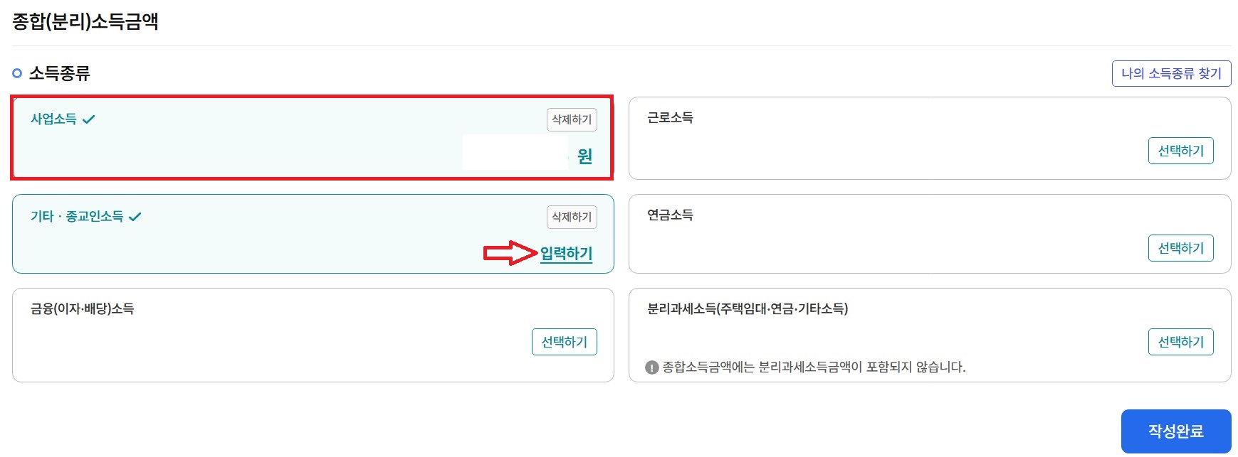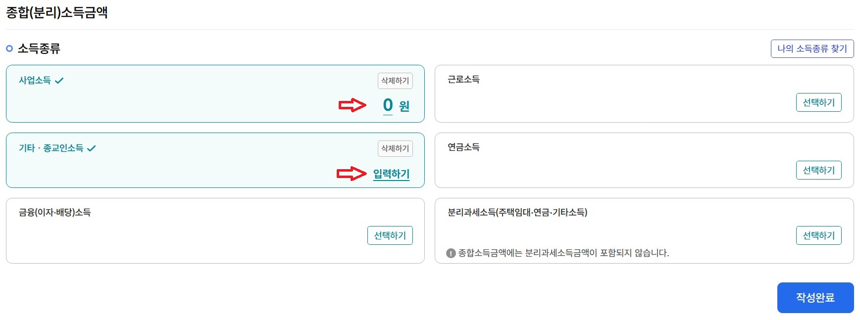 12. 신고를 진행했던 각 소득의 총 합계 금액을 확인 후 '작성완료'를 클릭합니다.