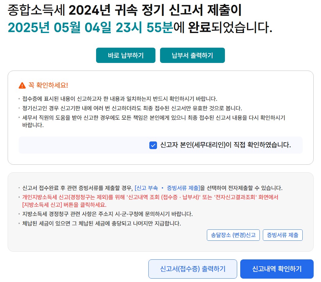 29. 신고 완료 날짜와 시간을 확인하고, '신고자 본인(세무대리인)이 직접 확인하였습니다' 란에 체크 후 '신고내역 확인하기'를 클릭합니다.