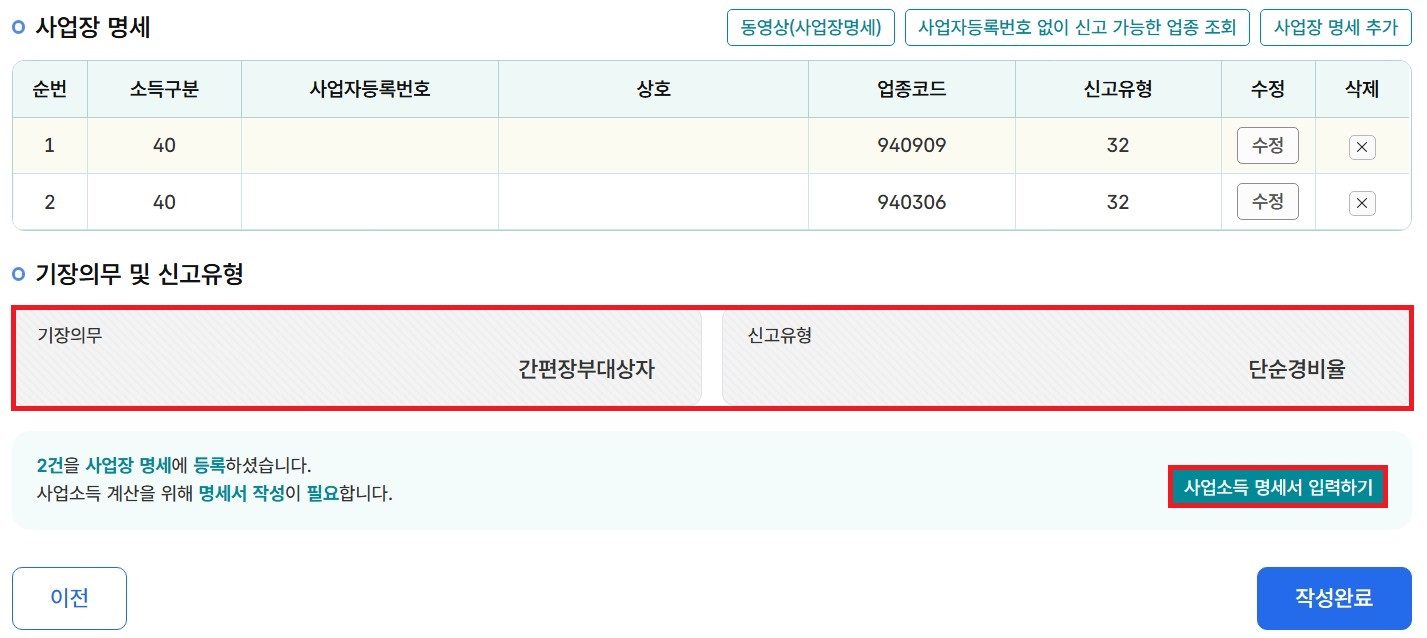 6-6. 사업장 명세 목록과 아래 기장의무 및 신고유형을 확인 후 '사업소득 명세서 입력하기'를 클릭합니다.