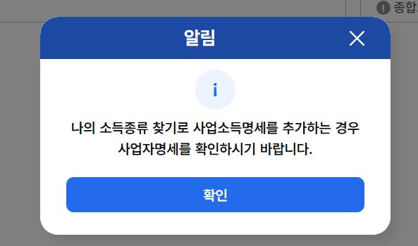 '나의 소득종류 찾기로 사업소득명세를 추가하는 경우 사업자명세를 확인하기 바랍니다'라는 알림창이 뜨면 '확인'을 누릅니다.
