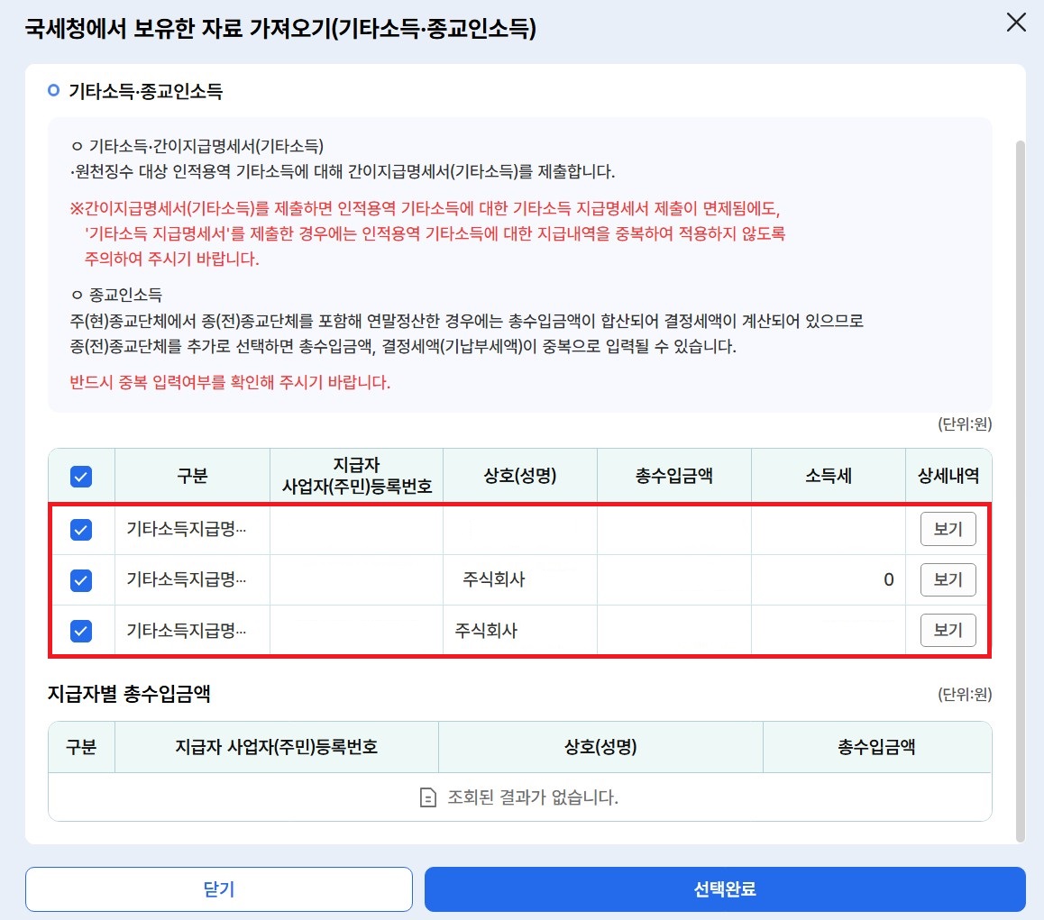 이벤트 경품 등에 당첨되어 제세공과금 22%를 낸 적이 있거나 제외하고 받으신 게 있다면 기타소득에 해당되므로 이 단계에서 신고를 하시면 됩니다. 만약 목록에 뜨지 않는다면 아직 5월 초라서 업체측에서 신고가 늦는 걸 수도 있으니 며칠 기다려보시거나 업체에 연락해 보세요.