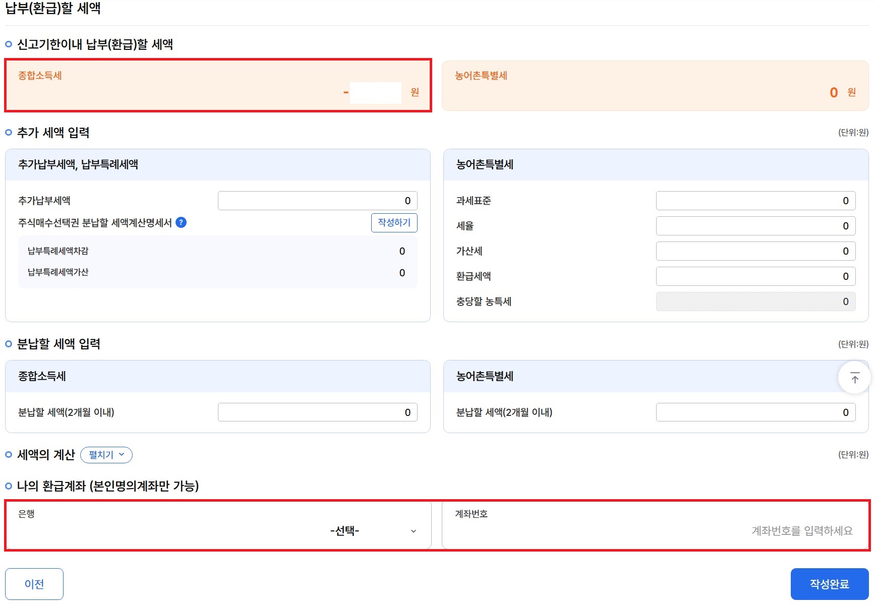 26. 납부 또는 환급 받을 세액을 확인 후, 환급받으실 세액이 있으신 분들은 환급받으실 은행명과 계좌번호를 입력합니다.