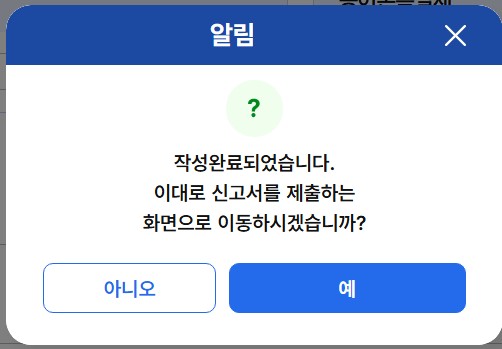 27. 드디어 모든 작성이 완료되었습니다. '예'를 클릭 후 신고서 제출 단계로 넘어갑니다.