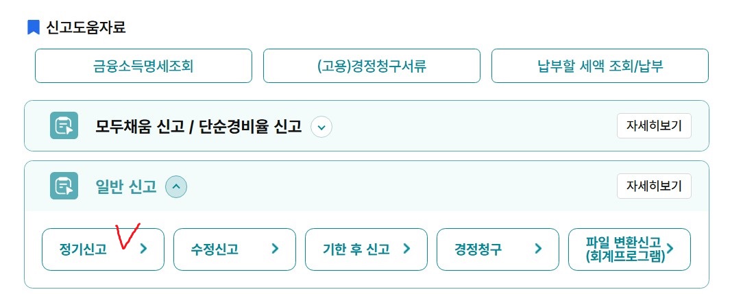 저는 모두채움 신고 대상자였지만, 추가 사항이 있어 새롭게 작성하기 위해 '일반신고-정기신고'를 택했어요.