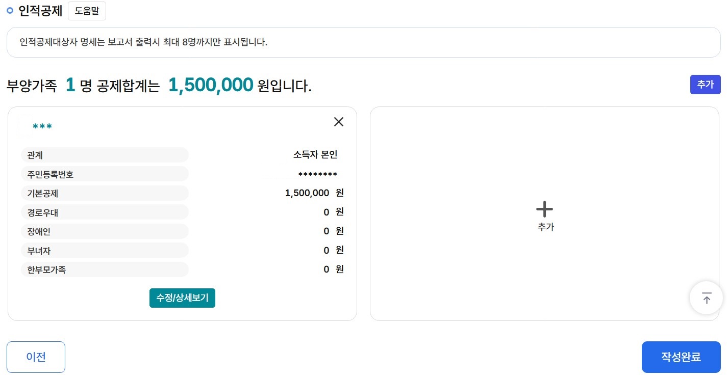 14. 인적공제 단계입니다. 부양가족이 있으시거나 경로우대, 장애인, 부녀자, 한부모가족에 해당되시면 입력 후 '작성완료'를 클릭합니다.