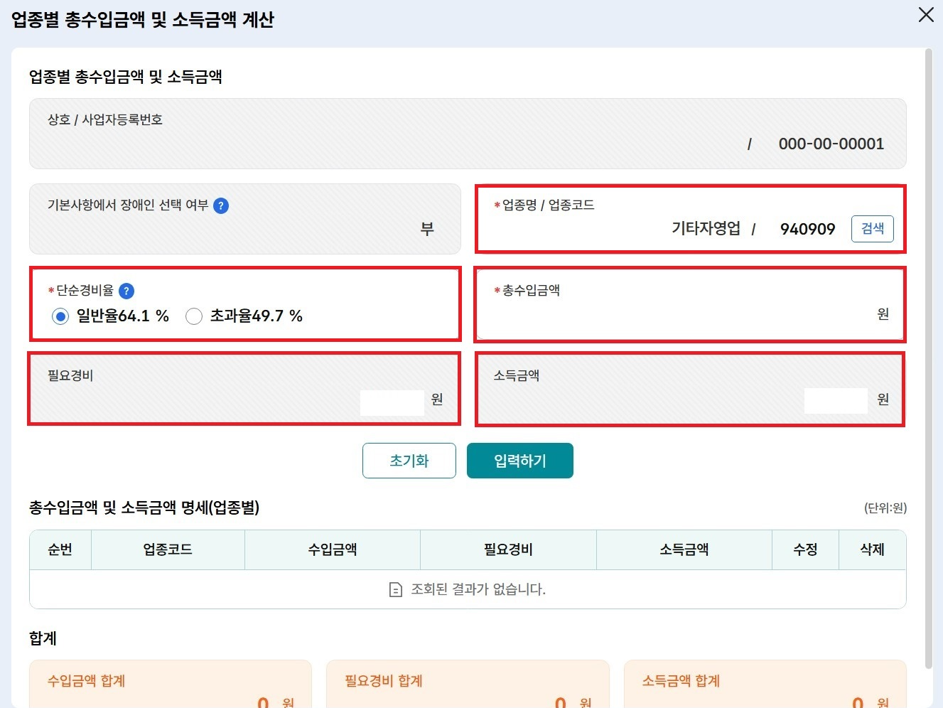 6-9. '업종코드번호'를 확인하고, 단순경비율은 '일반율 64.1%'를 선택하고, '총수입금액'과 '필요경비', '소득금액'까지 모두 확인한 다음 맞으면 '입력하기'를 클릭합니다.(*직접 입력의 경우 총수입금액을 입력하면 필요경비와 소득금액이 자동 계산됩니다. 저 같은경우 940306은 여기부터 나왔어요.)
