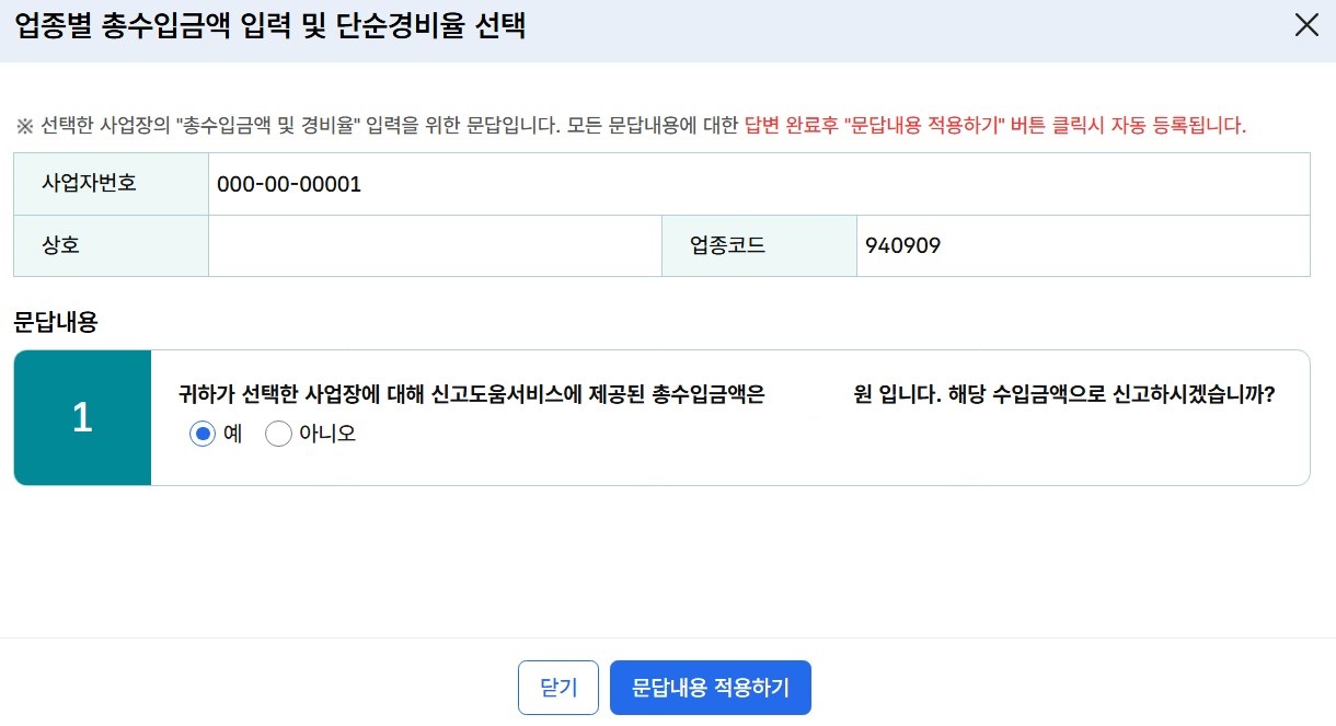 6-8. 저 같은 경우 940909는 신고된 자료가 있어서 해당 수입금액으로 신고하겠냐는 질문이 떴어요. 이런 경우 '문답내용 적용하기'를 클릭합니다.