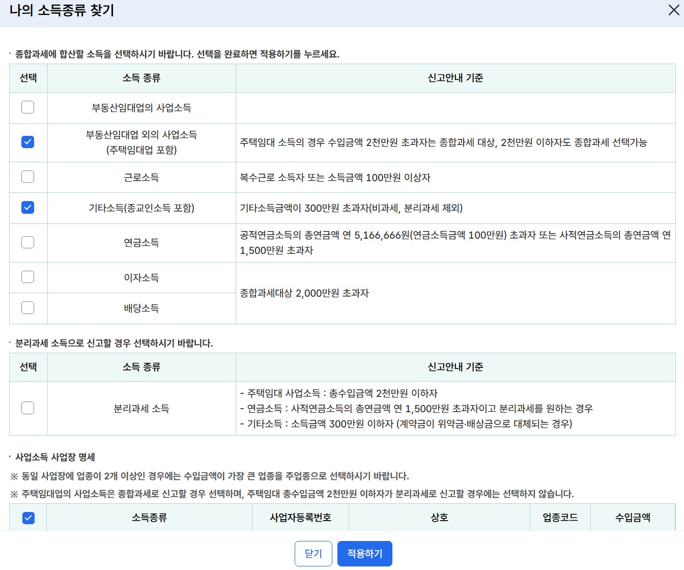 5. 신고할 소득 종류를 클릭하고 '적용하기'를 누릅니다.